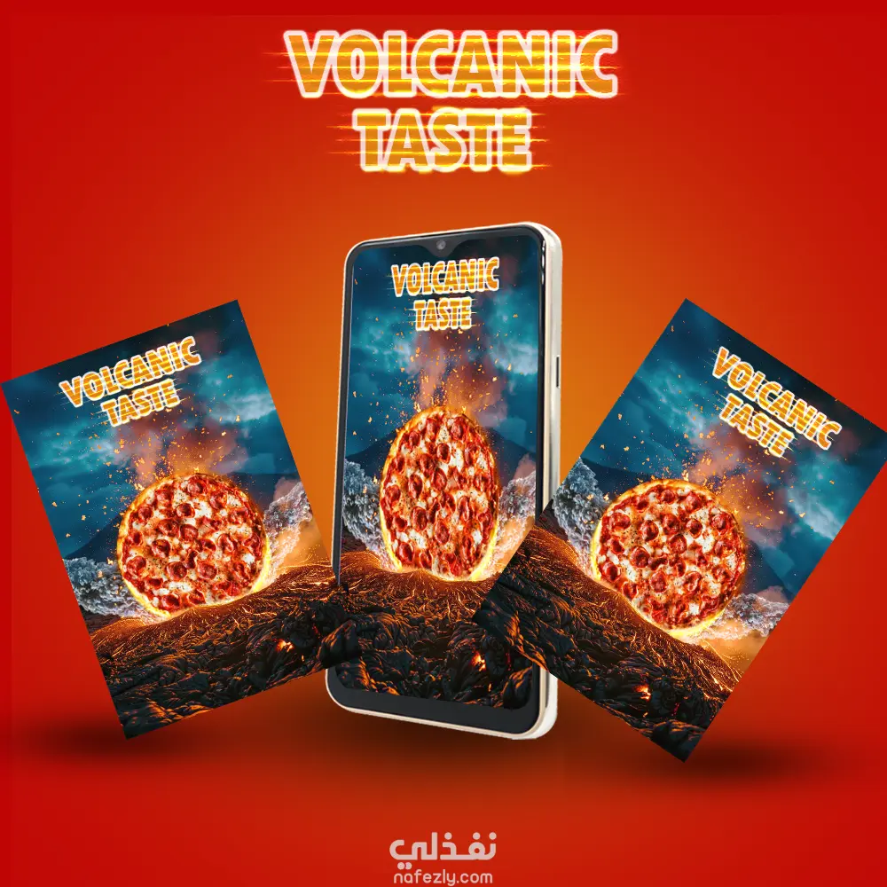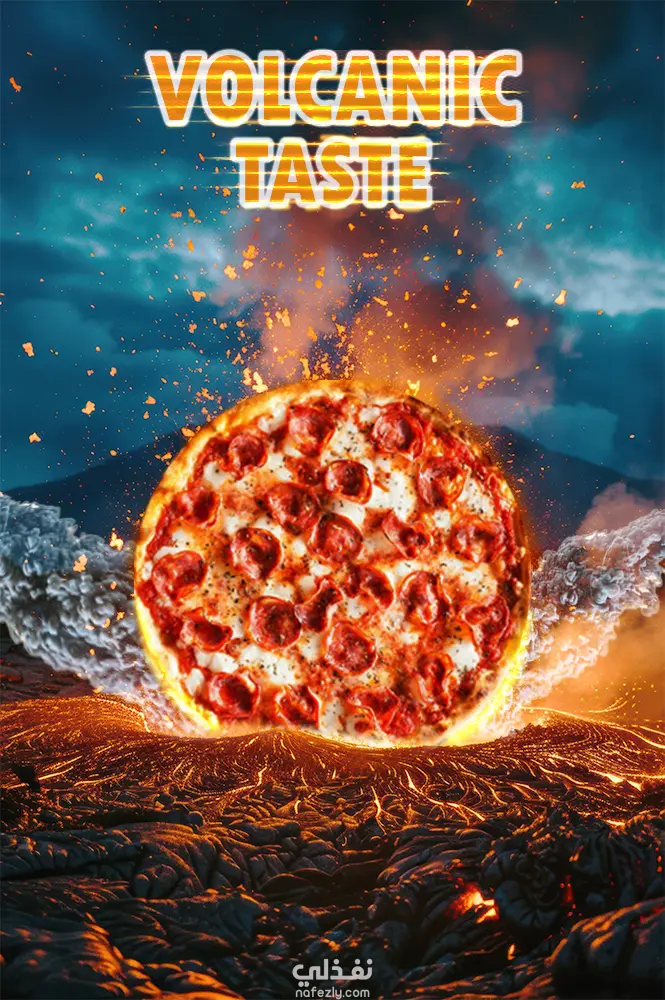 "تصميم إعلاني إبداعي يعتمد على فن الدمج الرقمي (Photo Manipulation). تم العمل على دمج منتج (بيتزا) داخل بيئة بركانية لإيصال إحساس الحرارة والطعم القوي. مميزات العمل: دمج واقعي للعناصر المشتتة وتوحيد الإضاءة. إضافة تأثيرات ضوئية (Lighting Effects) وتوهج للنصوص لتعزيز الطابع السينمائي. تصحيح وتعديل الألوان (Color Grading) لضمان تناسق المشهد بالكامل."