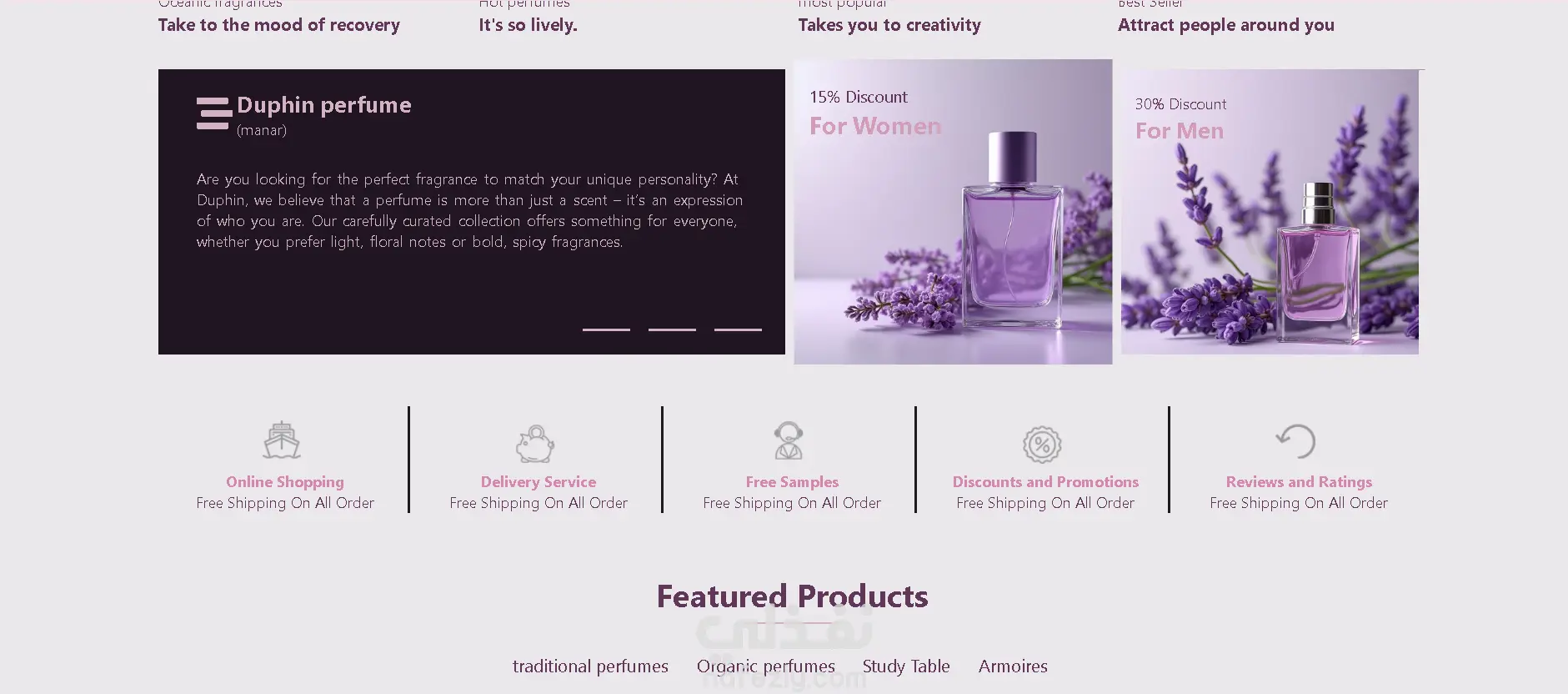 موقع إلكتروني مخصص لبيع وشراء العطور، تم تطويره باستخدام HTML5 و CSS3 فقط بدون أي أطر عمل خارجية.