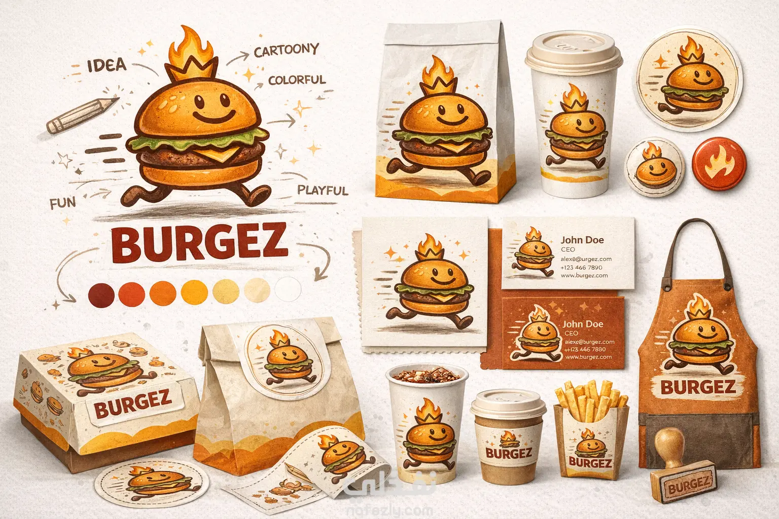 BURGEZ هو مطعم وجبات سريعة مستهدف الشباب والعائلات، يتميز بطابعه المرح والكرتوني، مع شعار ديناميكي يمثل برجر شخصي يتحرك ويعكس الطاقة والمرح. الهدف من المشروع هو تصميم هوية بصرية متكاملة تعكس شخصية العلامة التجارية، وتضمن تطبيقها على جميع الوسائط، سواء مطبوعة أو رقمية، بطريقة جذابة ومتسقة