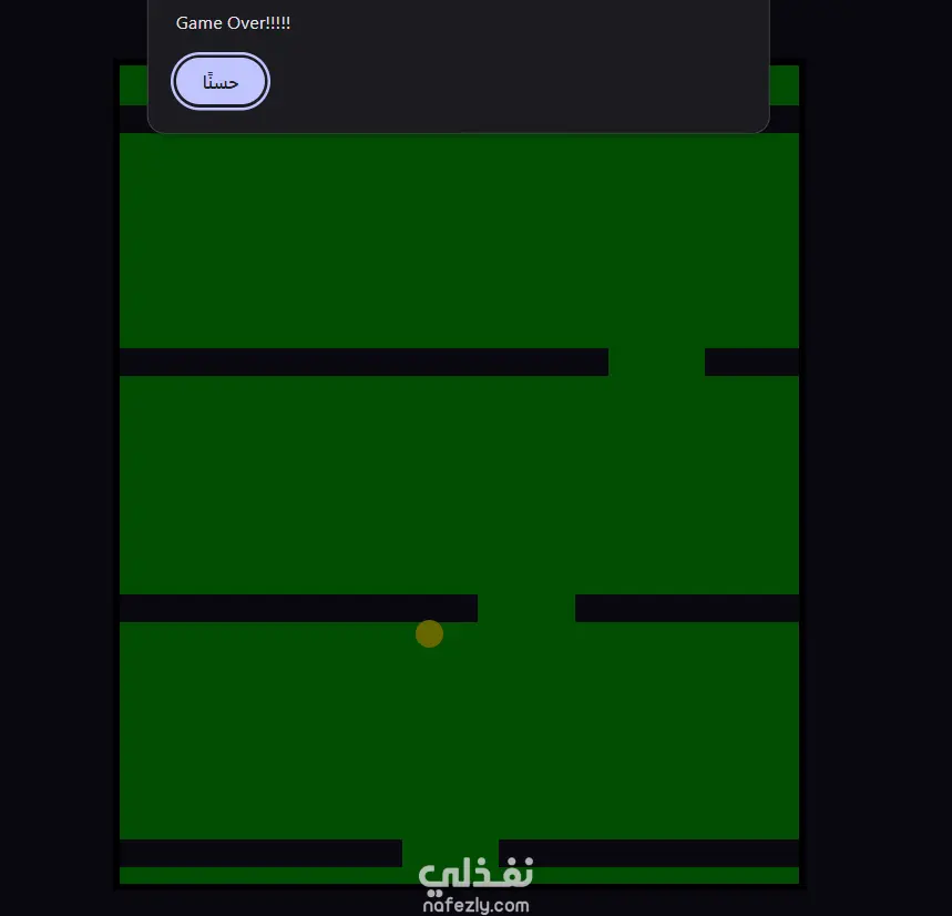 لعبة بسيطة عبارة عن تحريك الكرة لتخطي الحواجز الموجودة باللون الاسود وعند اصطدام الكرة بالحاجز يعرض الموقع رسالة game over كما هو موضح الصور. تم التنفيذ بأستخدام HTML, CSS , JavaScript