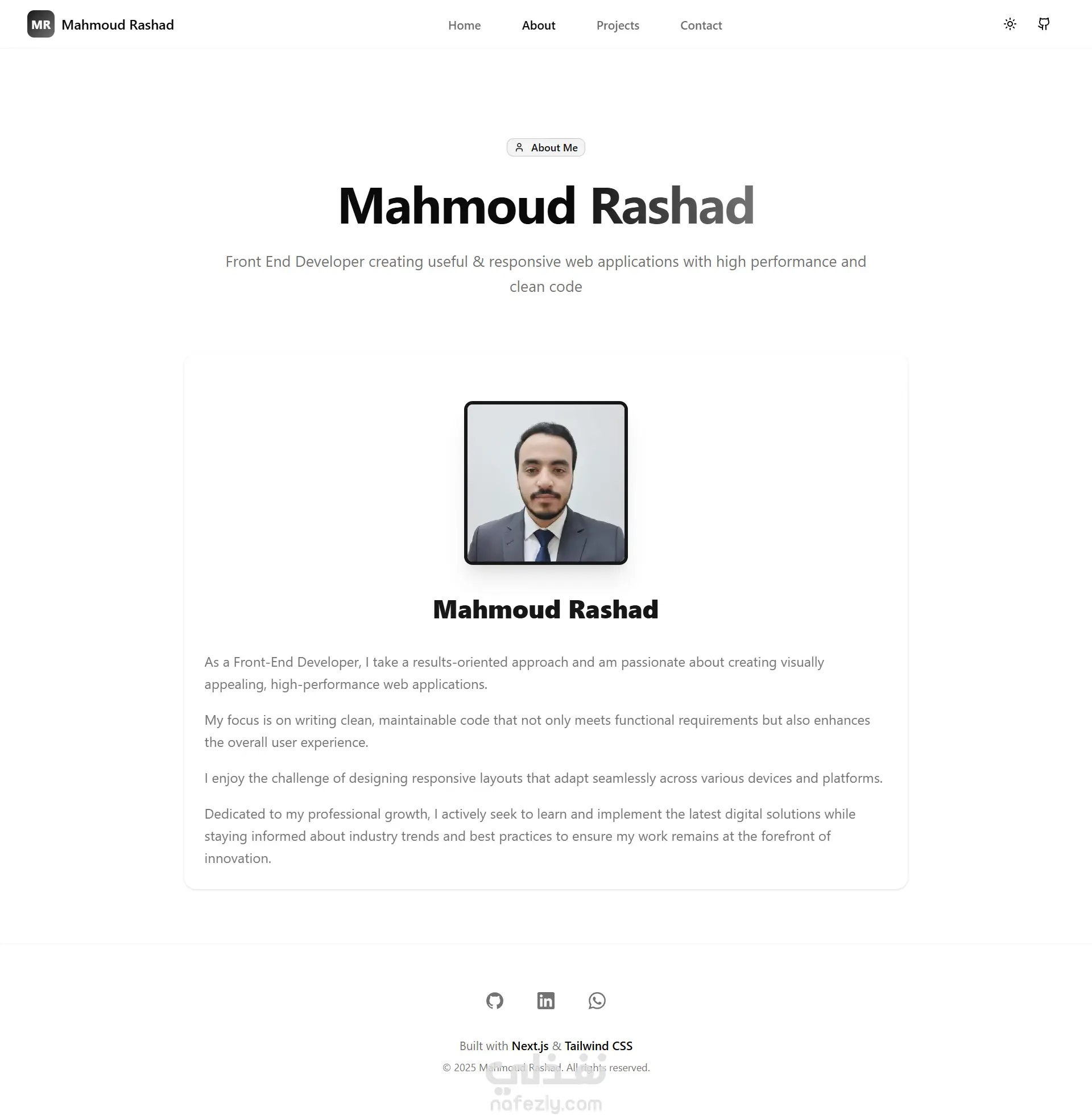 حرفية رقمية: معرض أعمالي الشخصي أكثر من مجرد معرض للمشاريع عندما بدأت بناء هذه المساحة، لم أكن أريد مجرد سيرة ذاتية جامدة، بل أردت بناء "بيت رقمي" يلتقي فيه كود البرمجة مع شخصيتي. هذا الموقع هو انعكاس لفلسفتي الخاصة التي تؤمن بأن التكنولوجيا يجب أن تكون واضحة، سهلة الوصول، والأهم من ذلك أنها موجهة لخدمة الإنسان في المقام الأول. هذا الموقع لا يخبرك فقط بما يمكنني فعله، بل يوضح كيف أفكر وكيف أواجه التحديات وأحل المشكلات. حيث يلتقي التصميم مع المنطق لغة بصرية مريحة: ركزت على واجهة بسيطة وخالية من التشتت، لأنني أؤمن بأن عمل المطور الحقيقي يجب أن يتحدث عن نفسه بوضوح دون ضجيج بصري لا داعي له. رؤية متكاملة للنمو: من خلفيتي الأكاديمية في نظم المعلومات الإدارية وصولاً إلى تعمقي في أحدث أطر العمل البرمجية، صممت هذا الموقع ليظهر رحلة تطوري، ليس فقط أين أقف الآن، بل إلى أين أتجه مستقبلاً. المرونة كمعيار أساسي: تعاملت مع كل بكسل بعناية لضمان أن تكون التجربة ممتعة وسلسة لكل زائر، سواء كان يتصفح من هاتف محمول أو من شاشة عرض كبيرة. الأساس التقني تم بناء الموقع بدقة باستخدام أحدث تقنيات الويب لضمان أداء فائق السرعة وتدفق منطقي يسهل على الزائر التعرف على هويتي المهنية والتقنية.