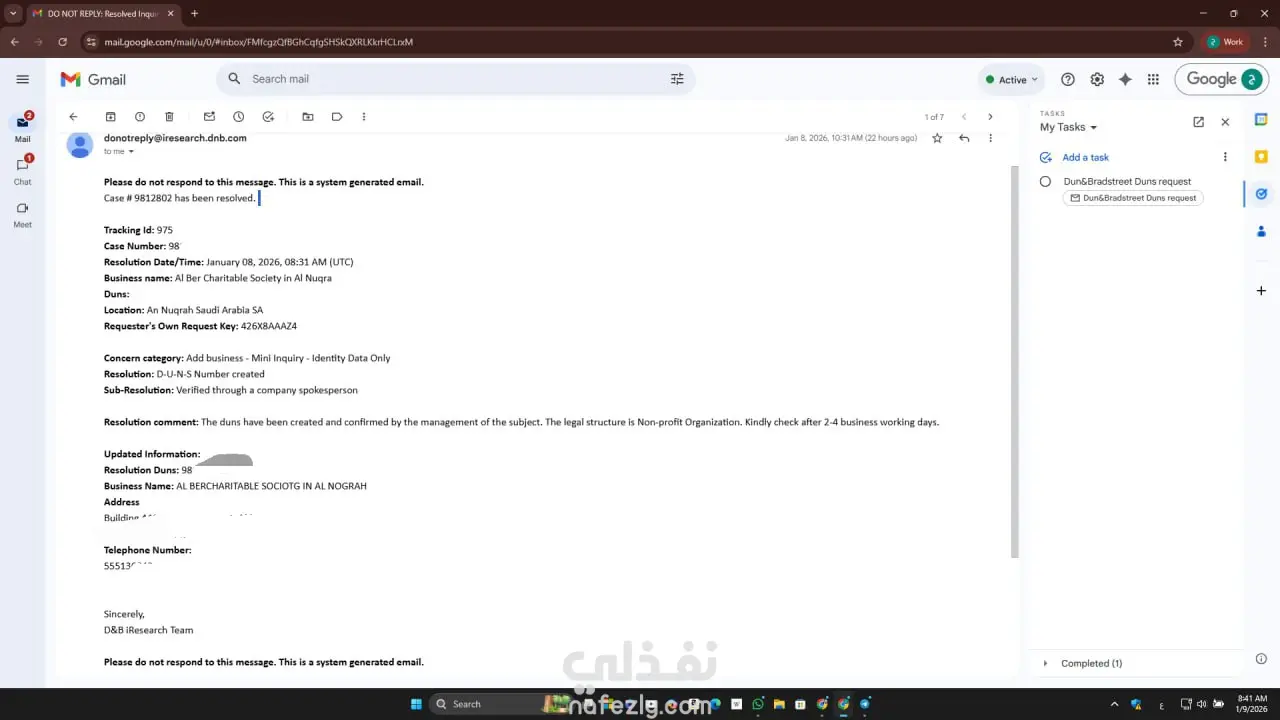 قمت بفضل الله بإتمام إجراءات تسجيل وتوثيق مؤسسة (قطاع غير ربحي) لدى شركة Dun & Bradstreet العالمية واستخراج رقم التعريف الموحد (DUNS Number) الخاص بها بنجاح. ​المهام التي تم إنجازها: ​التواصل والمراسلة: إدارة المراسلات باللغة الإنجليزية مع فريق D&B iResearch Team. ​تدقيق البيانات: مراجعة وتصحيح الاسم القانوني والعنوان لضمان تطابقها مع المعايير الدولية. ​حل المشكلات: متابعة الطلب (Case) والرد على الاستفسارات حتى تم إصدار القرار بالموافقة (Resolution: Created). ​النتيجة: حصول العميل على الرقم المعتمد لتوثيق حساباته على المنصات العالمية (مثل Apple, Google, Meta). ​ملاحظة: تم إخفاء بيانات العميل في الصور المرفقة حفاظاً على الخصوصية والسرية المهنية.