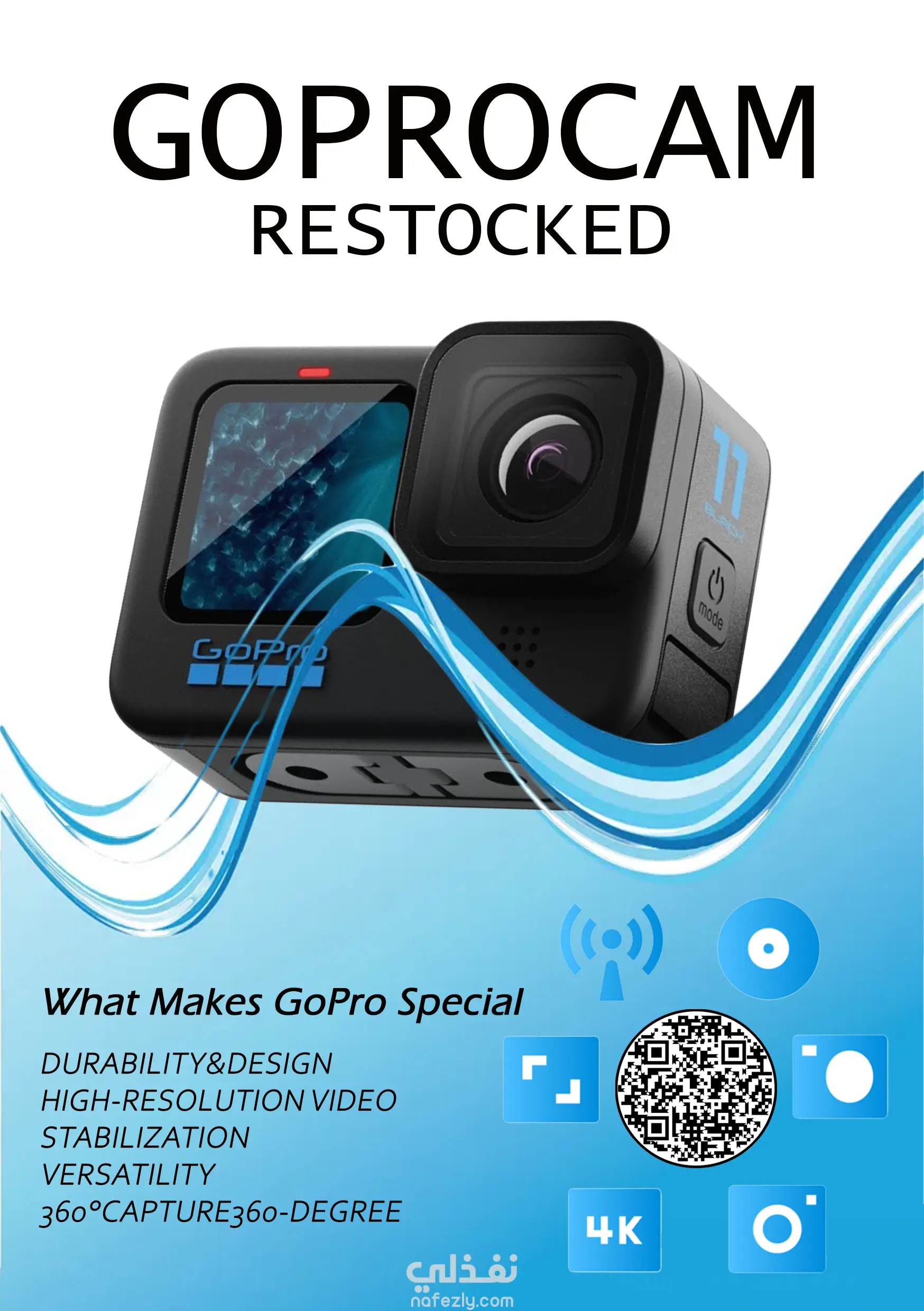 تم إبراز الكاميرا كعنصر أساسي في منتصف التصميم مع إضاءة واضحة تُظهر تفاصيل المنتج وجودته العالية. العنوان “GOPROCAM RESTOCKED” جاء بخط قوي وواضح لجذب الانتباه والتأكيد على توفر المنتج من جديد.