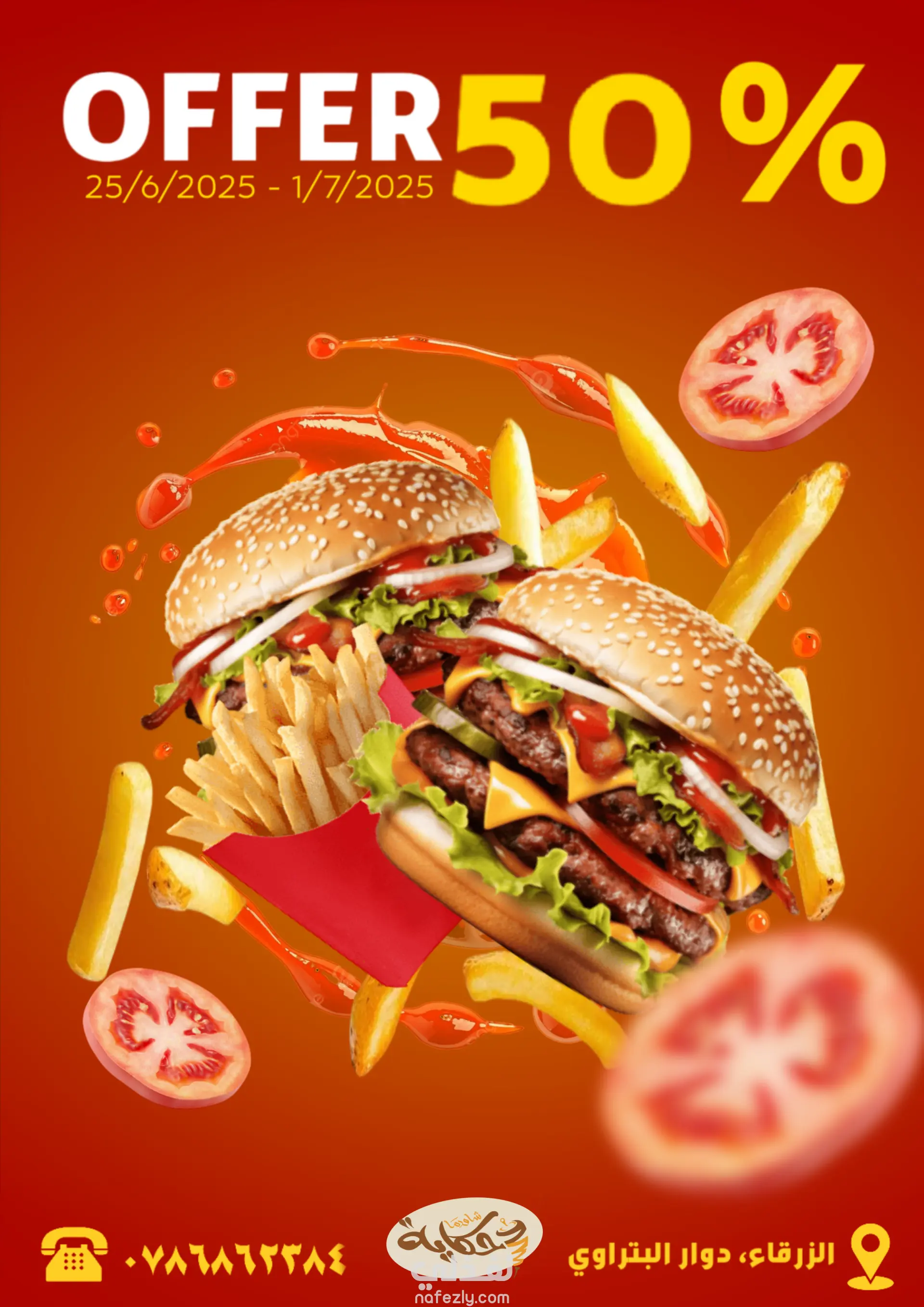 بوستر إعلاني "إفتراضي" لمطعم. نبذة: بوستر إعلاني يحوي عرضا جديدا لمطعم. التفاصيل: الألوان: تم استعمال ألوان تحوي في دلالاتها معاني المأكولات. النصوص: تم استعمال نصوص كبيرة مميزة لإيصال فكرة العرض بشكل سريع للناظر. العناصر: تم استعمال عناصر بما يتعلق بالعرض والفكرة العامة.