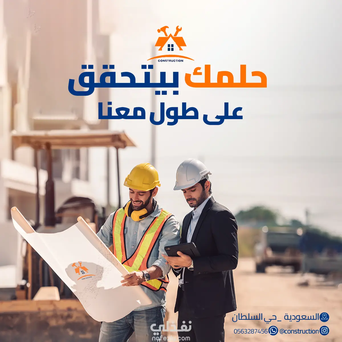 تم استخدام ألوان احترافية (الأزرق والبرتقالي) لخلق توازن بين الجدية والتحفيز، مع صور معبّرة تعكس بيئة العمل الهندسية.