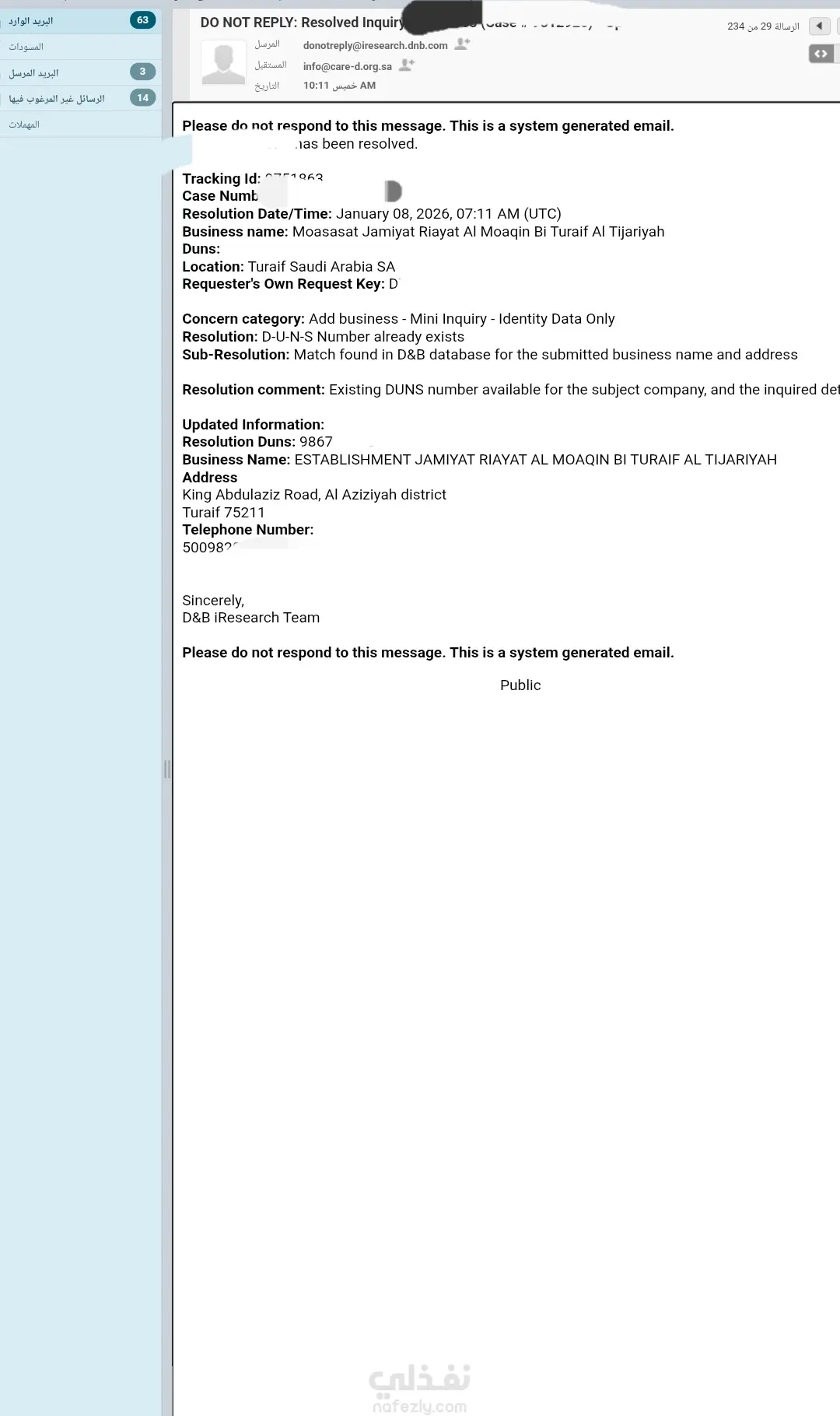 قمت بفضل الله بإتمام إجراءات تسجيل وتوثيق مؤسسة (قطاع غير ربحي) لدى شركة Dun & Bradstreet العالمية واستخراج رقم التعريف الموحد (DUNS Number) الخاص بها بنجاح. المهام التي تم إنجازها: التواصل والمراسلة: إدارة المراسلات باللغة الإنجليزية مع فريق D&B iResearch Team. تدقيق البيانات: مراجعة وتصحيح الاسم القانوني والعنوان لضمان تطابقها مع المعايير الدولية. حل المشكلات: متابعة الطلب (Case) والرد على الاستفسارات حتى تم إصدار القرار بالموافقة (Resolution: Created). النتيجة: حصول العميل على الرقم المعتمد لتوثيق حساباته على المنصات العالمية (مثل Apple, Google, Meta). ملاحظة: تم إخفاء بيانات العميل في الصور المرفقة حفاظاً على الخصوصية والسرية المهنية.