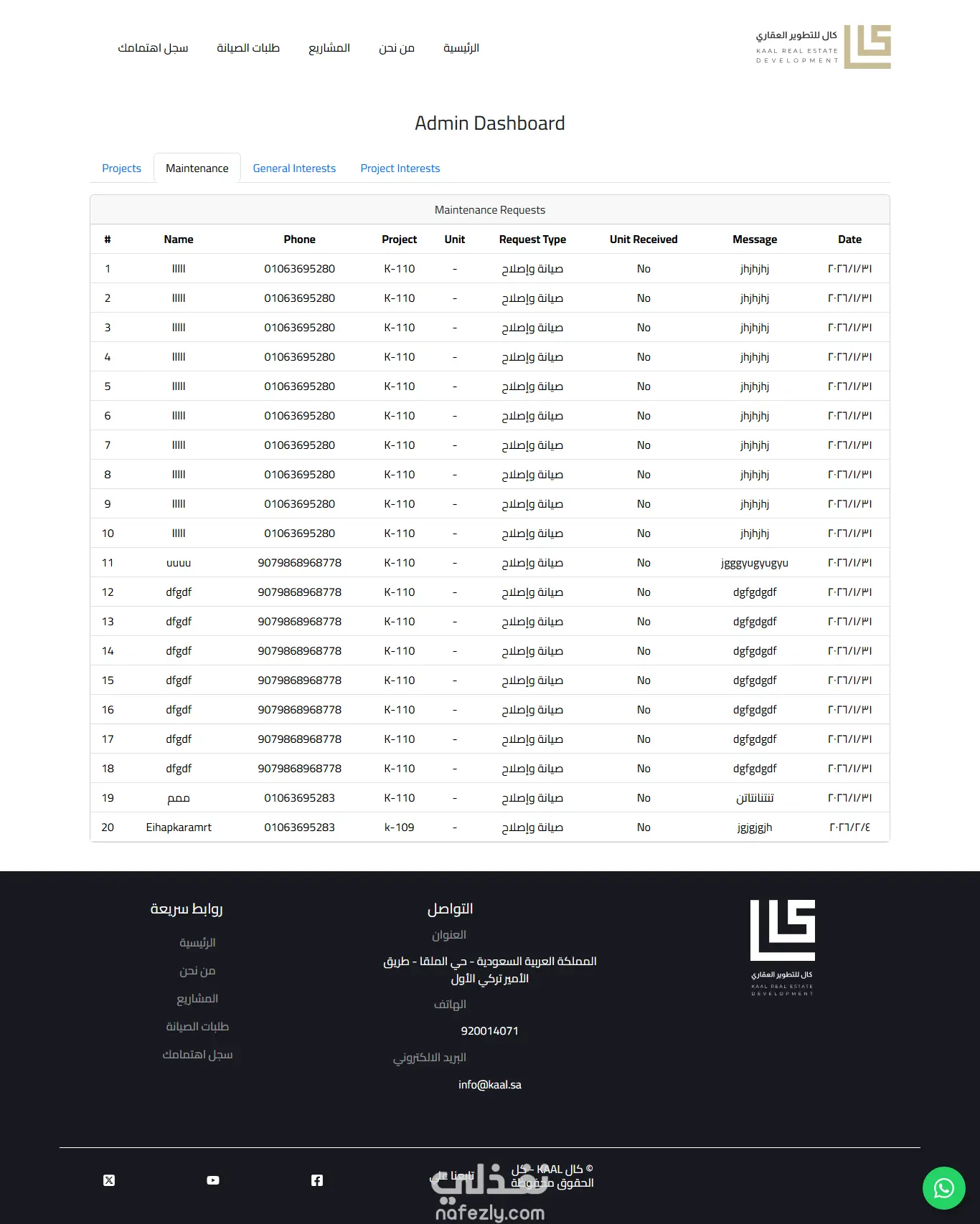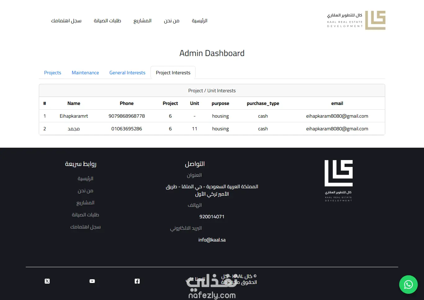 The backend was built using Laravel (PHP), with MySQL as the database system for securely and efficiently managing data related to real estate projects, units, maintenance requests, and user interests.