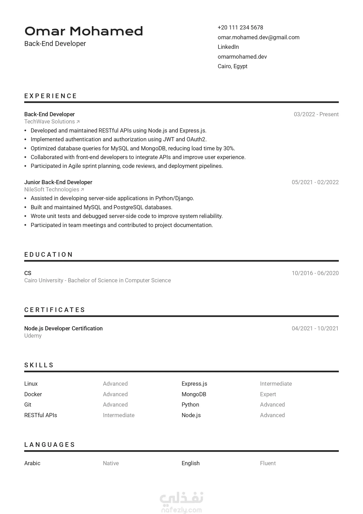 تم التركيز على تنسيق واضح وسهل القراءة مع استخدام الكلمات المفتاحية الشائعة في مجال تطوير Back-End لضمان ظهور أفضل في أنظمة ATS.