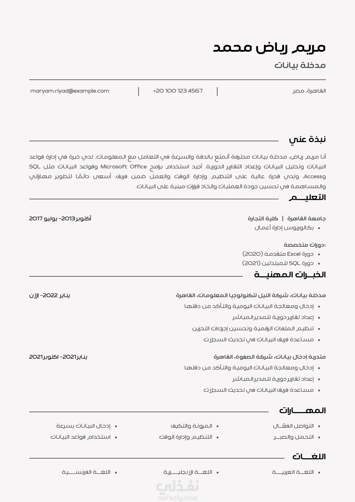 قمت بإعداد سيرة ذاتية احترافية بصيغة ATS CV لمدخلة بيانات، تتضمن: 1. النبذة الشخصية. 2. التعليم والخبرات العملية. 3. المهارات التقنية والشخصية المناسبة للوظيفة. 4. اللغات والهوايات. 5. تنسيق احترافي جاهز للطباعة والرفع على منصات التوظيف.