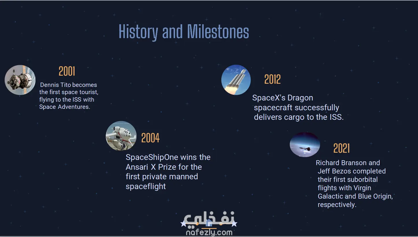 محطات تاريخية: توثيق أهم الإنجازات منذ رحلة "دينيس تيتو" كأول سائح فضائي عام 2001، وصولاً إلى الرحلات السياحية في 2021.