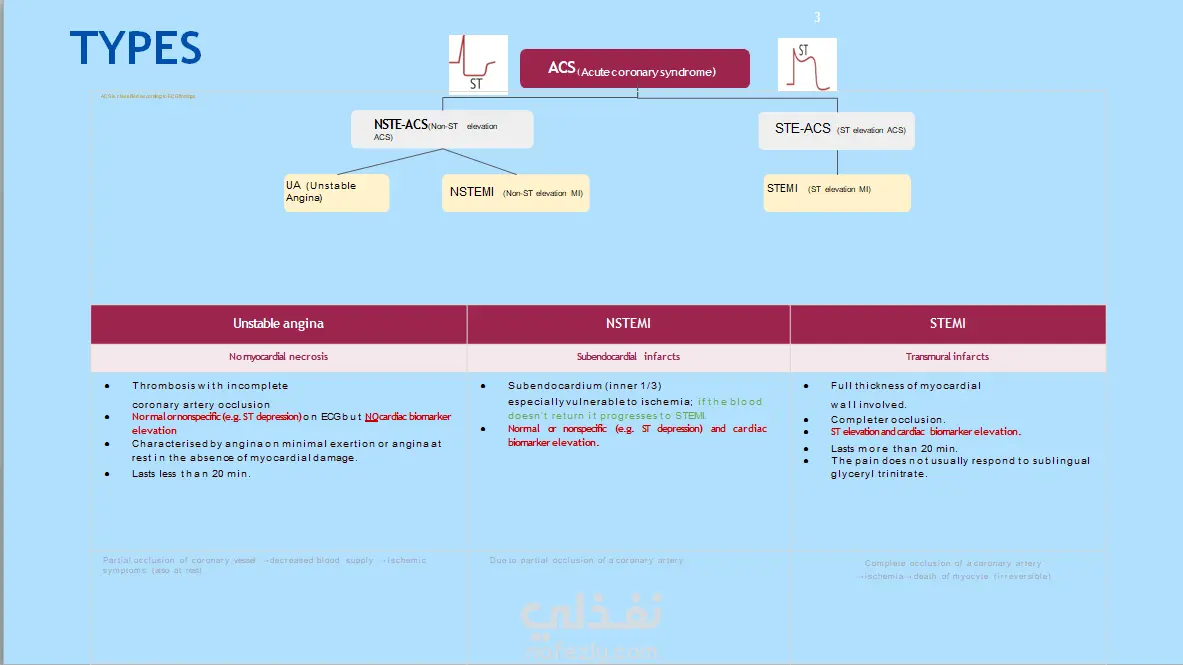 التصنيف الإكلينيكي: التمييز بين أنواع المتلازمة الثلاثة (STEMI, NSTEMI, Unstable Angina).