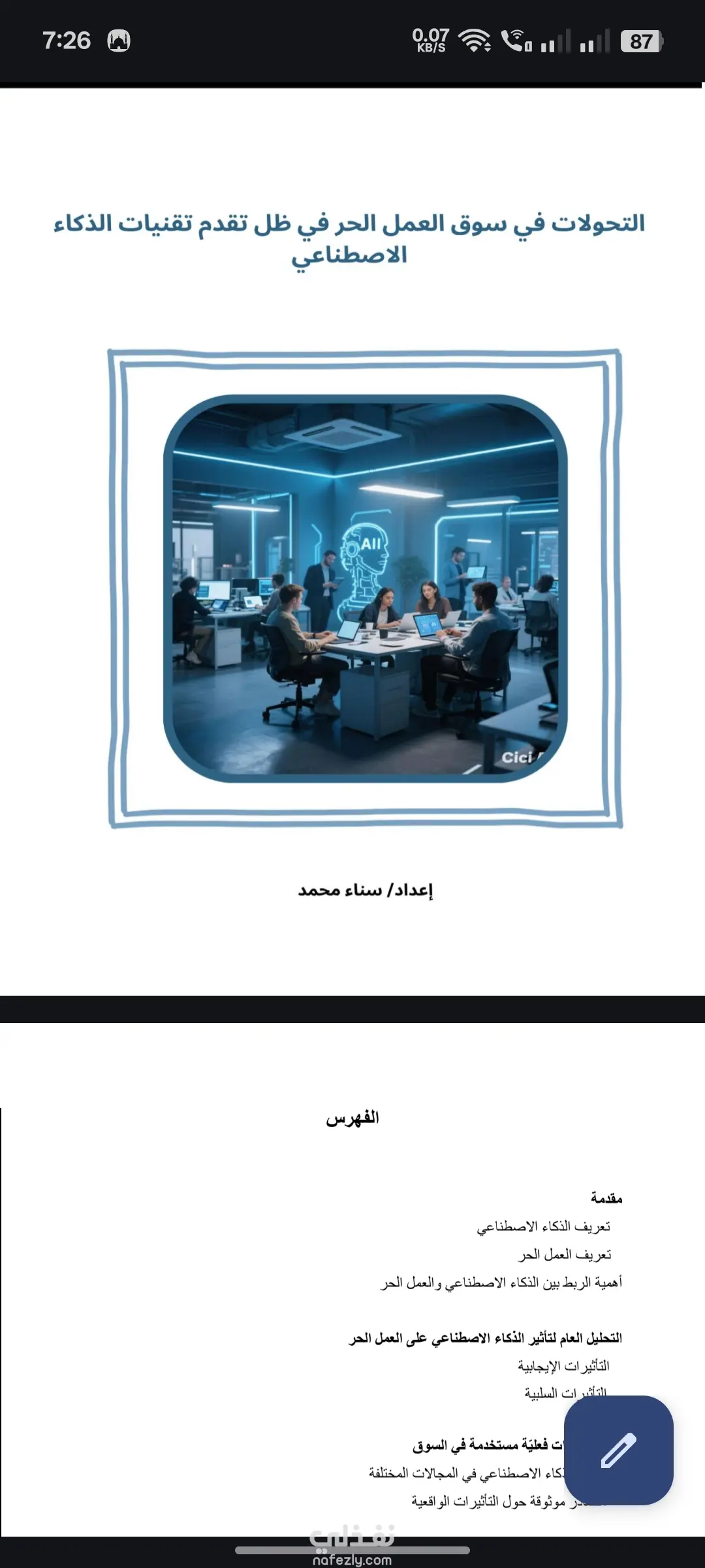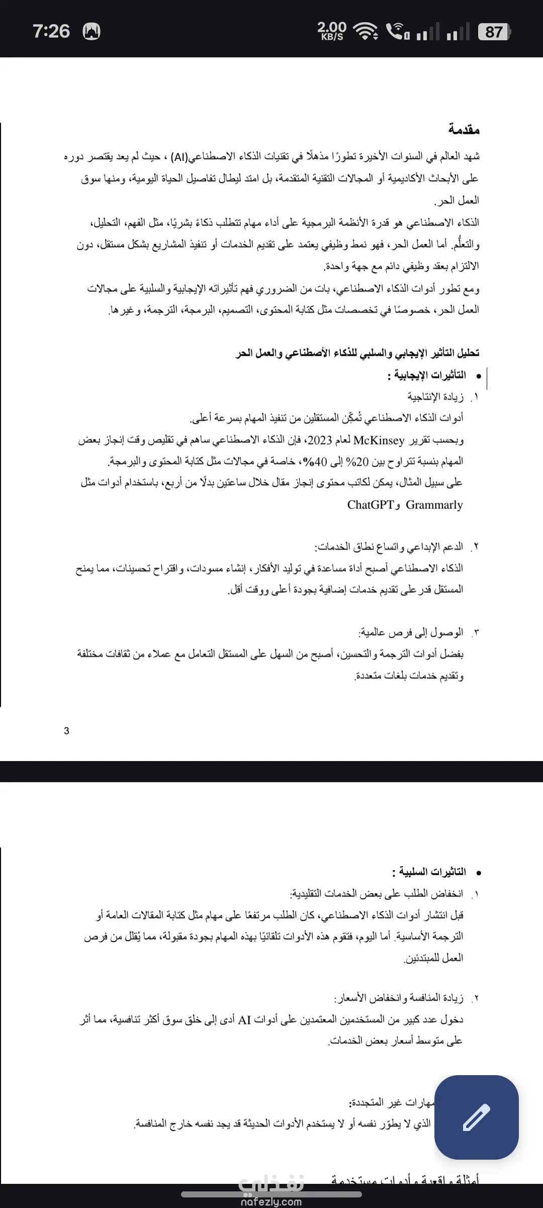 يتناول هذا التقرير تحليلاً معمقاً لتأثير الذكاء الاصطناعي على العمل الحر، من خلال تعريف المفاهيم الأساسية، واستعراض التأثيرات الإيجابية مثل زيادة الإنتاجية وتوسيع نطاق الفرص، والتأثيرات السلبية مثل انخفاض الطلب على بعض الخدمات وزيادة المنافسة. كما يعرض التقرير أدوات الذكاء الاصطناعي المستخدمة في مجالات مثل كتابة المحتوى، التصميم الجرافيكي، البرمجة، والترجمة، مع أمثلة واقعية من السوق. ويختتم بتوصيات عملية للمستقلين حول كيفية التكيّف مع هذا التغير التكنولوجي واستثماره لصالحهم بدلاً من مقاومته.