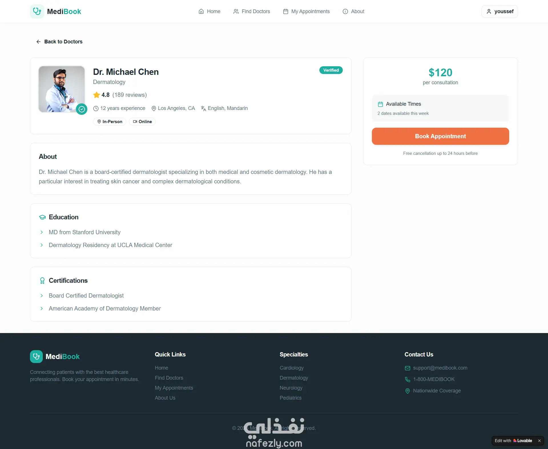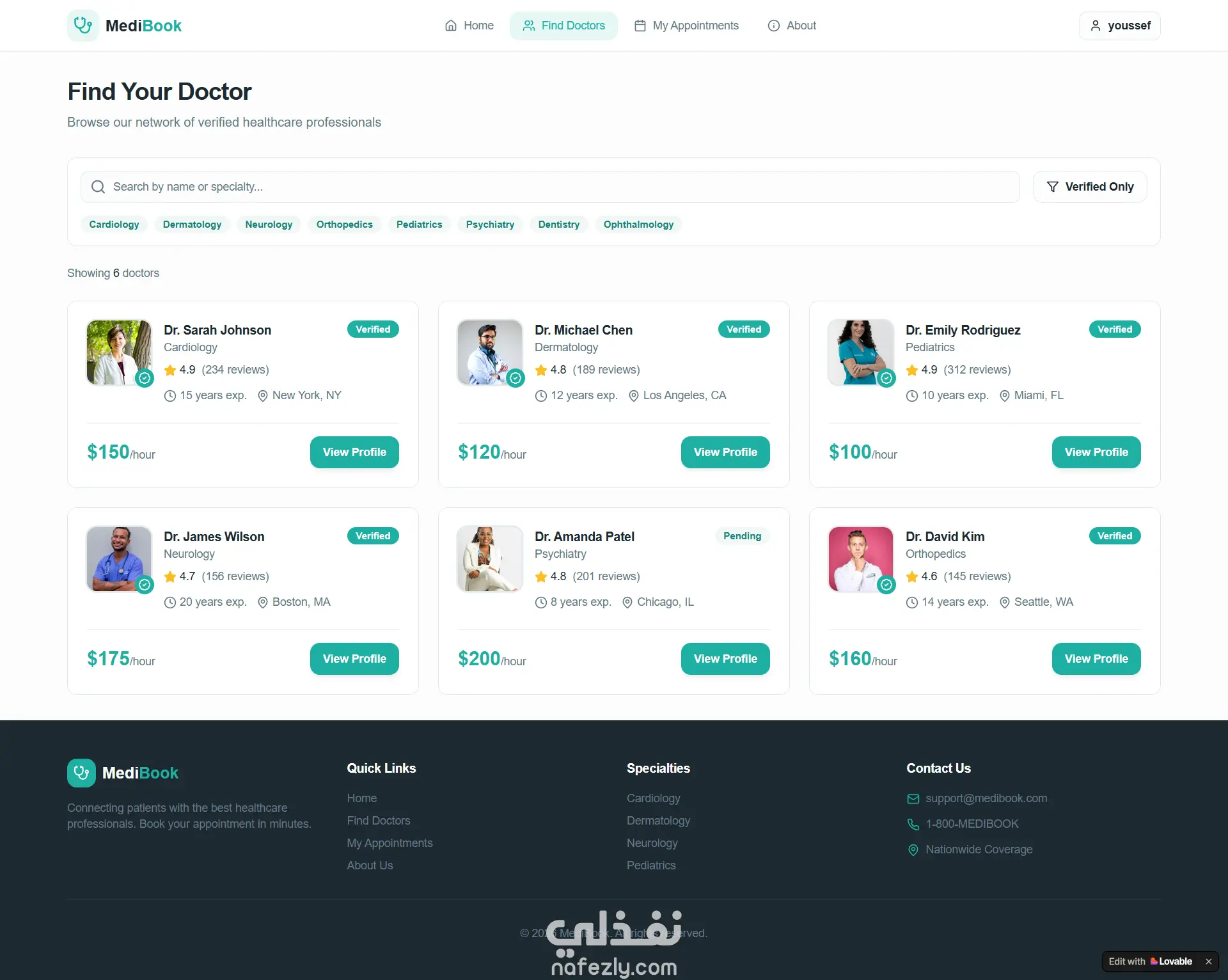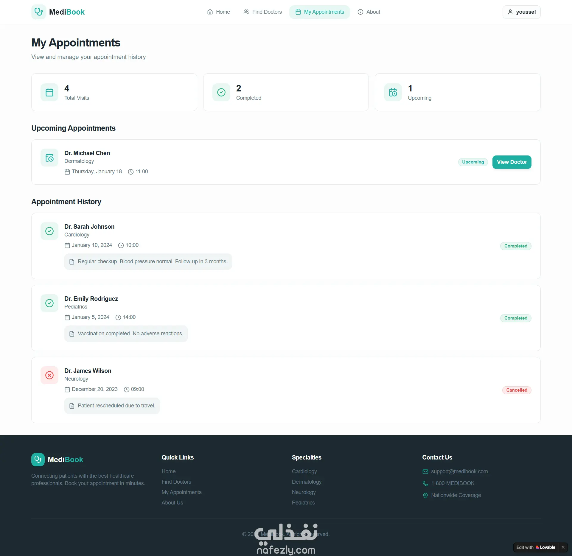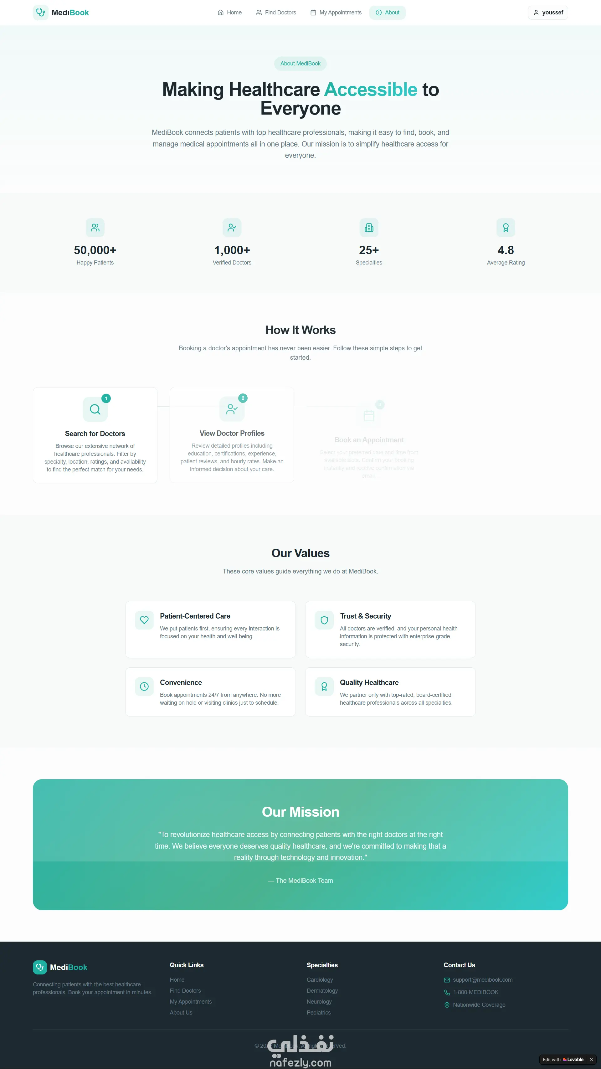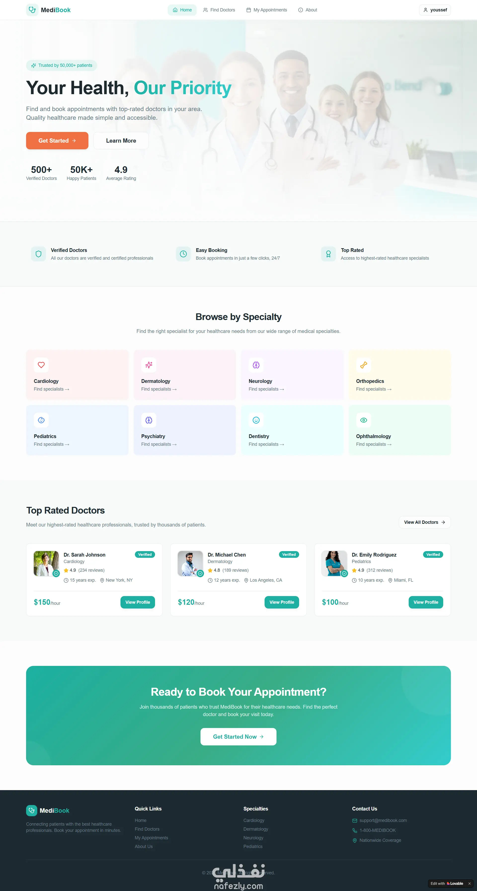 مشروع **MediBook** هو منصة رقمية متكاملة تهدف إلى تسهيل عملية حجز المواعيد الطبية والربط بين المرضى وأفضل الأطباء المتخصصين. يتميز المشروع بتصميم عصري (Clean UI) يركز على تجربة المستخدم (UX) لضمان سهولة الوصول إلى الرعاية الصحية. أولاً: صفحات المشروع 1. **الصفحة الرئيسية (Home Page):** * تستعرض واجهة جذابة تحتوي على شعار المشروع "Your Health, Our Priority". * قسم لإحصائيات المنصة (عدد الأطباء، المرضى، والتقييمات). * قسم "البحث حسب التخصص" (Browse by Specialty) الذي يضم تخصصات مثل القلب، الجلدية، الأعصاب، وغيرها. * عرض سريع لأعلى الأطباء تقييماً. 2. **صفحة البحث عن طبيب (Find Your Doctor):** * تتضمن نظام فلترة متقدم للبحث عن الأطباء بالاسم أو التخصص. * خيار لتصفية النتائج للأطباء الموثقين فقط (Verified Only). * بطاقات تعريفية للأطباء توضح: سنوات الخبرة، الموقع الجغرافي، التقييم، وسعر الكشف في الساعة. 3. **صفحة ملف الطبيب ونظام الحجز (Doctor Profile & Booking):** * عرض تفصيلي لبيانات الطبيب (النبذة الشخصية، التعليم، والشهادات). * **نافذة الحجز (Booking Modal):** تتيح للمستخدم اختيار (نوع الاستشارة: حضوري أو أونلاين)، اختيار التاريخ، والوقت المتاح، مع إمكانية إضافة ملاحظات إضافية. 4. **لوحة تحكم المواعيد (My Appointments):** * ملخص رقمي للمواعيد (إجمالي الزيارات، المكتملة، والقادمة). * تصنيف المواعيد إلى "مواعيد قادمة" و"سجل المواعيد السابقة". * عرض ملاحظات الطبيب بعد كل زيارة (Clinical Notes). 5. **صفحة "عن MediBook" (About Us):** * توضح رؤية وأهداف المشروع. * تشرح آلية عمل المنصة في 3 خطوات بسيطة. 6. **صفحة تسجيل الحساب (Authentication):** * واجهة بسيطة لإنشاء حساب جديد تطلب الاسم، البريد الإلكتروني، وكلمة المرور، مع تصميم جانبي يعزز ثقة المستخدم. ثانياً: مميزات المشروع التقنية * **التجاوب (Responsiveness):** الموقع مهيأ للعمل على جميع الشاشات (موبايل، تابلت، ديسكتوب). * **إدارة الحالة (State Management):** التعامل مع نماذج الحجز وتغيير حالات المواعيد (Upcoming, Completed, Cancelled). * **تجربة مستخدم سلسة:** استخدام الـ Modals للحجز دون مغادرة صفحة الطبيب.