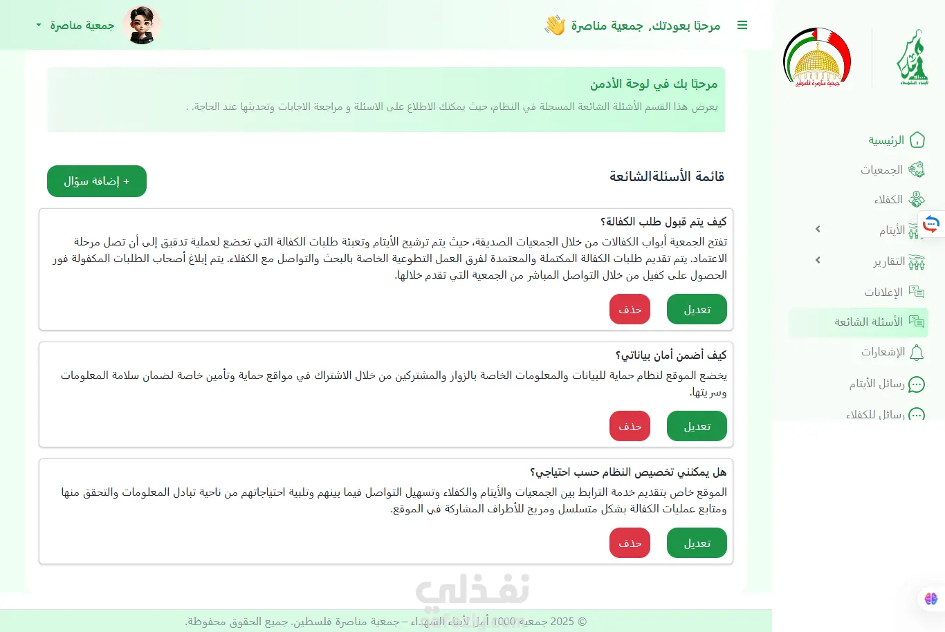 أمل – منصة إدارية متعددة المستخدمين لإدارة شؤون الأيتام والرعاية الاجتماعية منصة أمل هي نظام إداري رقمي متعدد المستخدمين، صُمم لإدارة برامج الأيتام والرعاية الاجتماعية من خلال سير عمل منظم وصلاحيات وصول مبنية على الأدوار. يدعم النظام عدة فئات من المستخدمين، تشمل المشرفين، الجمعيات، الكفلاء، الموظفين، والمتطوعين، حيث يمتلك كل دور لوحة تحكم وصلاحيات خاصة به، مما يتيح للمؤسسات العمل بكفاءة وأمان ضمن نظام مركزي موحّد. وبناءً على خصائص المنصة، تتيح أمل ما يلي: تسجيل الأيتام وإدارة ملفاتهم بشكل كامل إدارة الجمعيات والجهات المشاركة إدارة حسابات الكفلاء ومتابعة الكفالات تتبع السجلات المالية، الأرصدة، ووثائق الدفع مراجعة الحالات واعتمادها وإصدار التقارير إدارة الملفات والمستندات نظام مراسلات داخلية، إشعارات، وإعلانات استيراد البيانات عبر ملفات Excel وتقارير منظمة لوحات تحكم إدارية بصلاحيات وصول متعددة واجهة عربية مع جاهزية لدعم تعدد اللغات تم بناء منصة أمل لدعم العمل المؤسسي واسع النطاق، مع ضمان دقة البيانات، الشفافية، والتحكم الكامل في صلاحيات الوصول بين جميع المستخدمين المشاركين في سير العمل.
