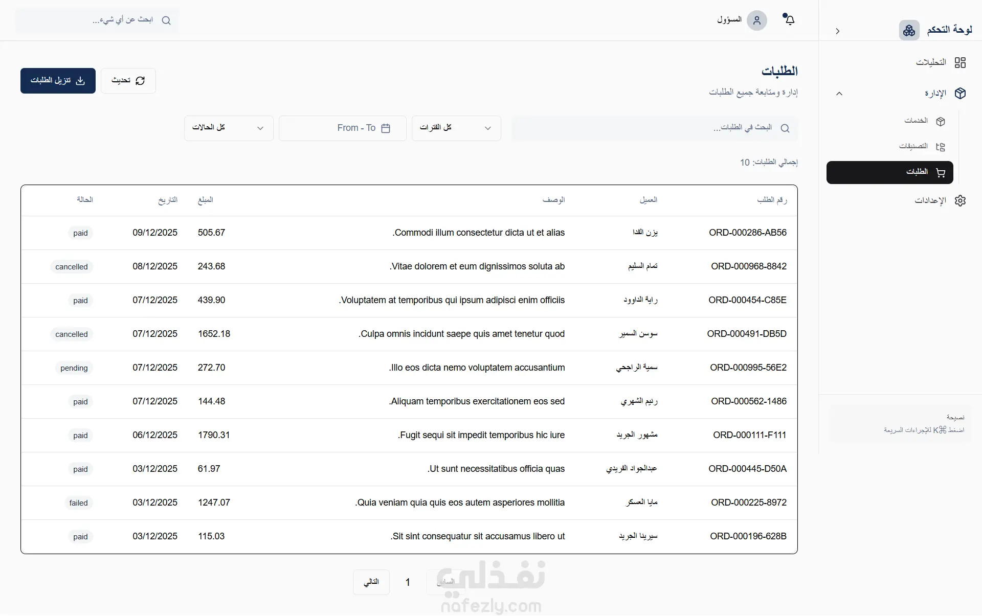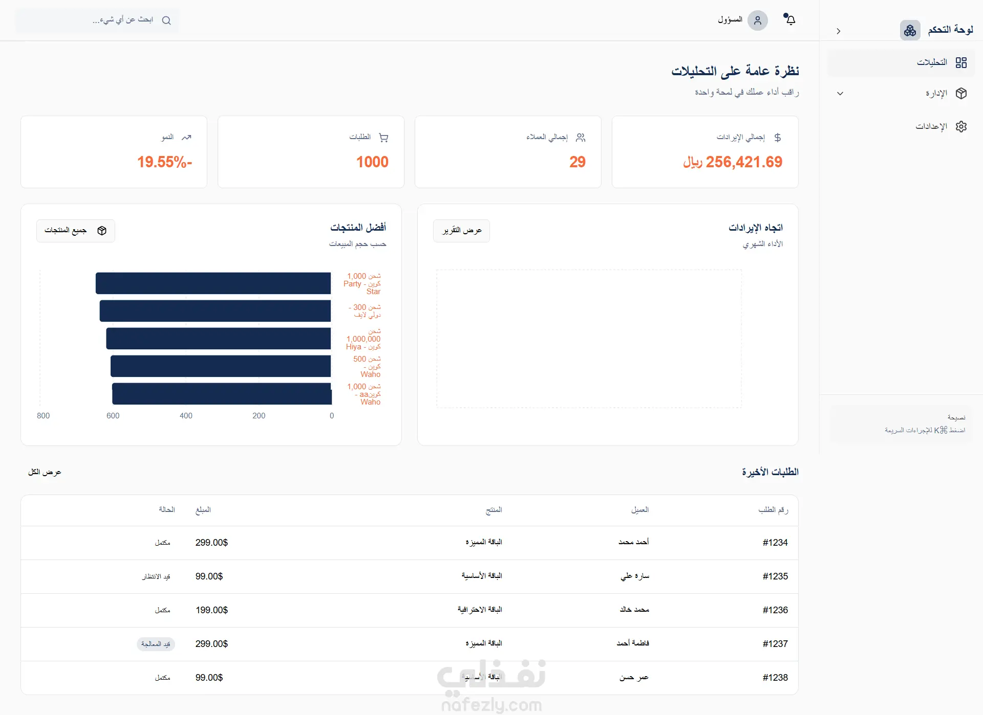 لوحة تحكم (Admin Dashboard) متكاملة لإدارة المنصة وتحليل الأداء، تتيح للإدارة متابعة المبيعات، الأرباح، والطلبات بشكل دقيق ومرن، مع تحكم كامل في المستخدمين والخدمات. مميزات لوحة التحكم - التحليلات والإحصائيات - عرض تحليلات المبيعات بشكل مرئي وواضح. - فلترة البيانات حسب: -- اليوم -- الشهر -- السنة -- فترات زمنية مخصصة - حساب الأرباح، نسبة الصعود والهبوط ومقارنة الأداء بين الفترات. - مؤشرات سريعة تساعد في اتخاذ القرار. - إدارة الطلبات (Orders Management) - عرض جميع الطلبات مع تفاصيل كاملة. مثل حالات الطلب: -- تم التنفيذ -- قيد الانتظار -- فشل الطلب - متابعة كل طلب بشكل منفصل وسهل. - إدارة المشاريع والخدمات والمنتجات - إضافة، تعديل، وحذف المشاريع والخدمات. - التحكم في أسعار وباقات الشحن. - تنظيم المحتوى بشكل احترافي داخل النظام. - إدارة المستخدمين والصلاحيات - لوحة تحكم مخصصة للإدارة (Admins). - إضافة وحذف الأدمنز. - تحديد الصلاحيات لكل أدمن حسب الدور (Roles & Permissions). - تأمين النظام ومنع الوصول غير المصرّح به. - التقنيات المستخدمة في لوحة التحكم Frontend Dashboard: React.js Backend: Laravel Integration: ربط كامل عبر RESTful APIs تحديث البيانات في الوقت الفعلي وتحكم سلس في العمليات. النتيجة النهائية لوحة تحكم احترافية وقوية تمكّن الإدارة من: متابعة الأداء المالي بدقة. إدارة الطلبات والخدمات بسهولة. التحكم في الصلاحيات والمستخدمين بأمان. تحسين كفاءة التشغيل واتخاذ قرارات مبنية على بيانات واضحة.