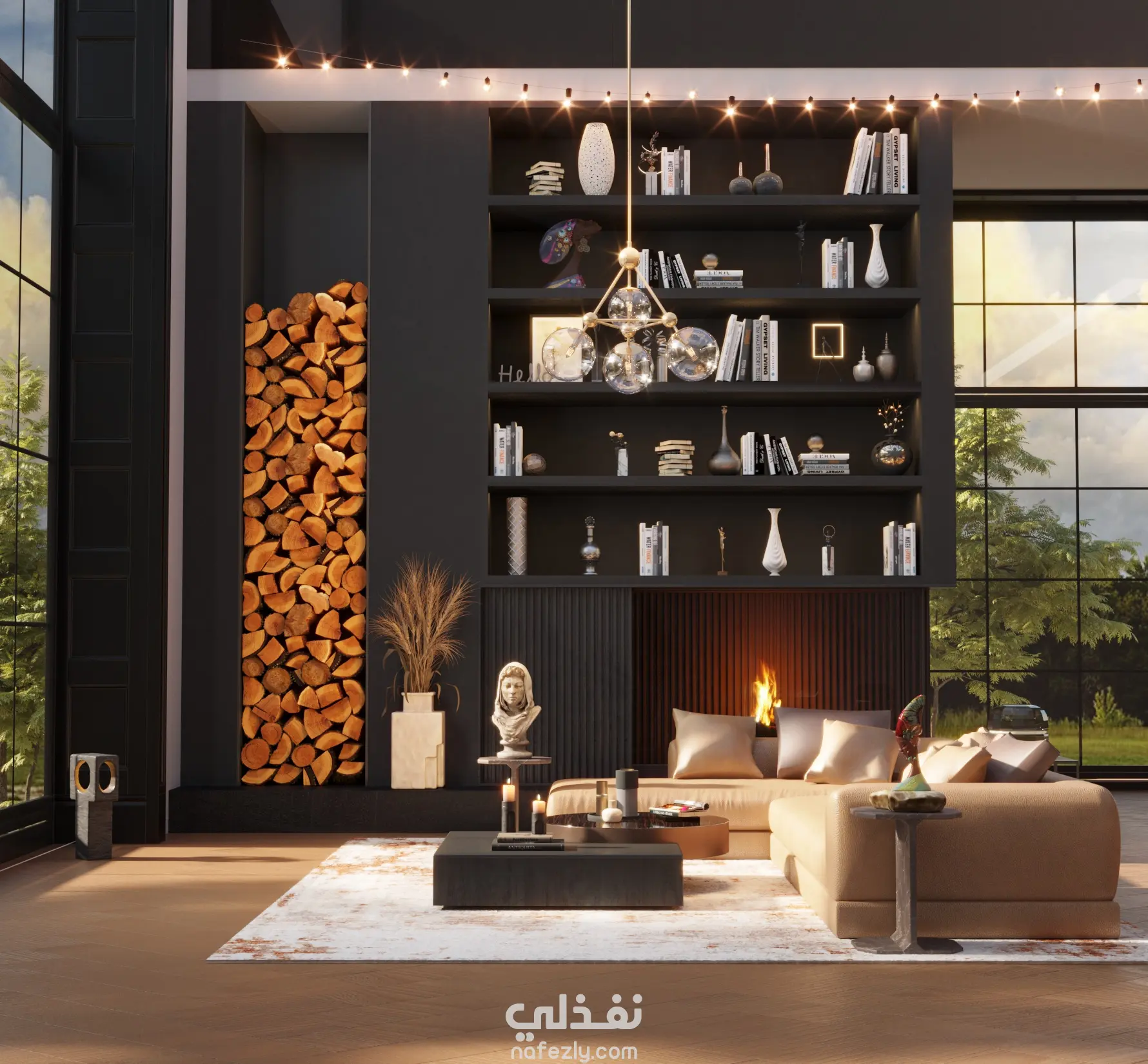 تم تصميم جلسة المعيشة بأسلوب صناعي راقٍ يعتمد على الخشب الغامق بتشطيبات فاخرة أضفت عمقًا وقوة على المساحة، مع كنب جلدي أنيق منح المكان طابعًا جريئًا وإحساسًا بالفخامة والراحة في آنٍ واحد.