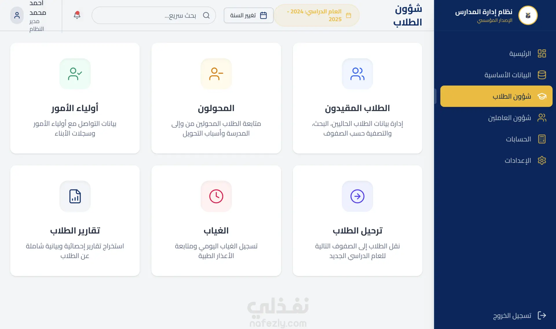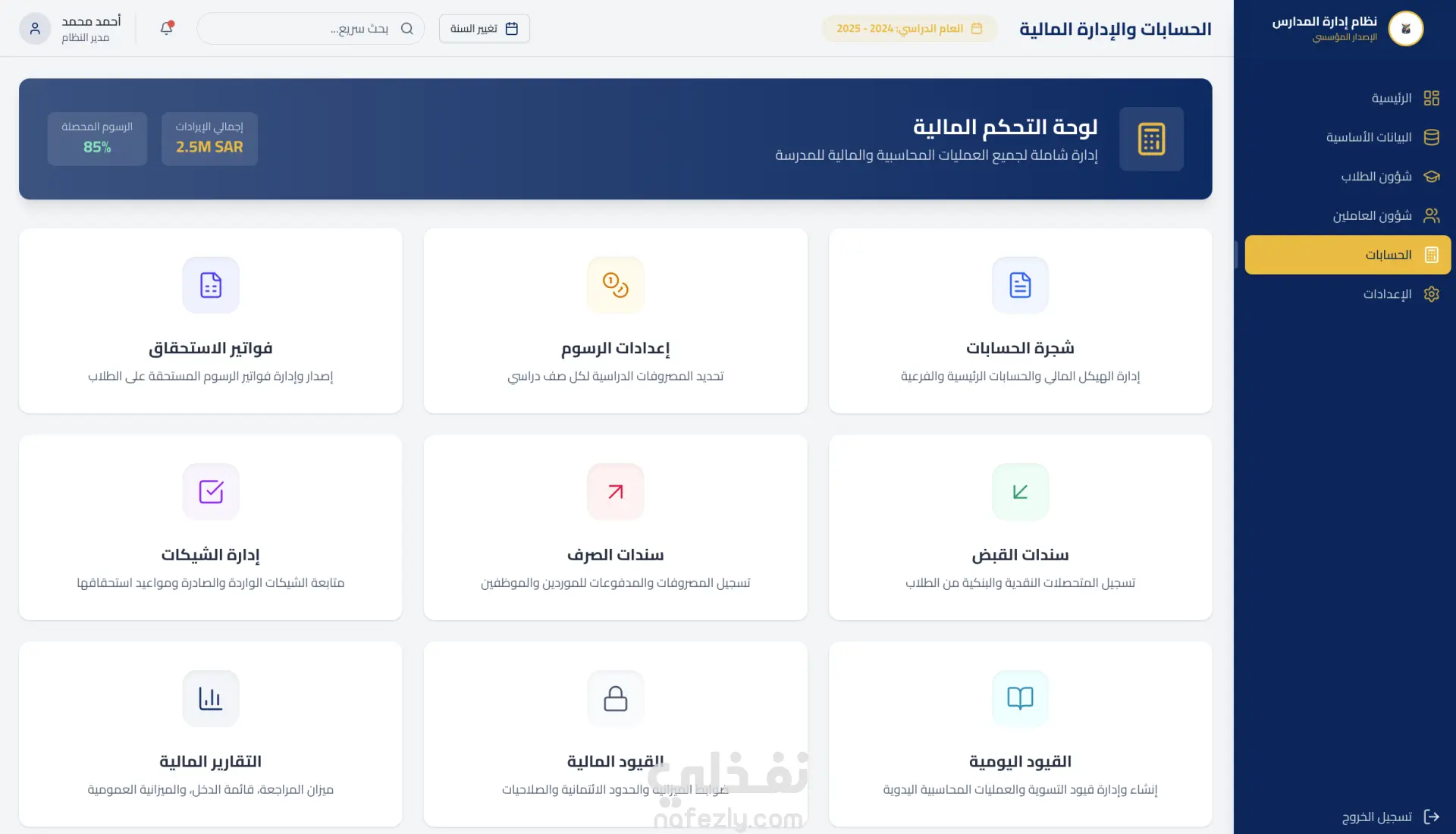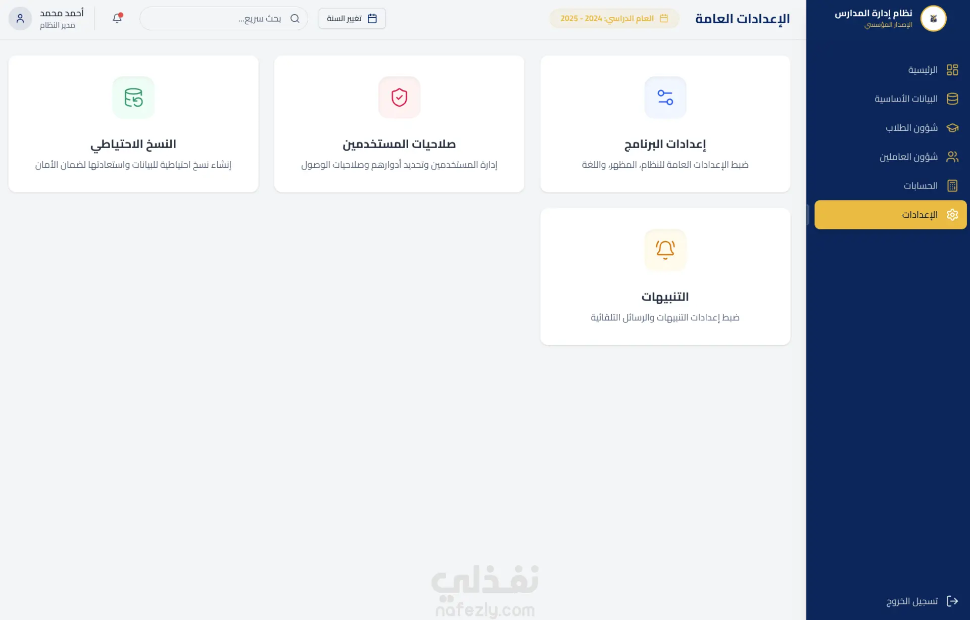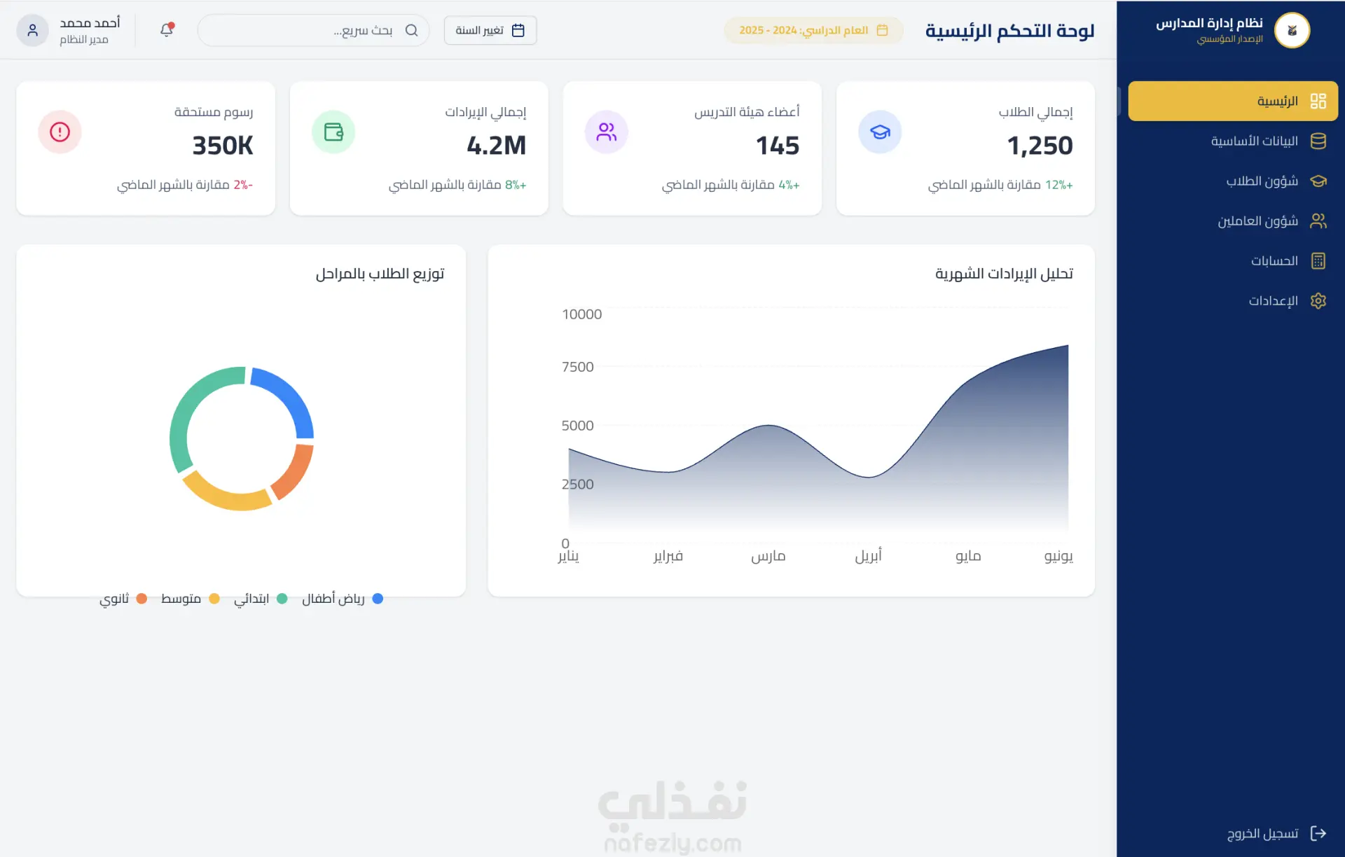 نظام الإدارة المدرسية المتكامل (ERP School System) عن البرنامج: يعد هذا النظام حلاً تقنياً شاملاً صُمم خصيصاً لتلبية احتياجات المؤسسات التعليمية الطموحة. يعمل البرنامج على أتمتة كافة العمليات الإدارية والمالية والتعليمية، مما يقلل من الأخطاء البشرية ويوفر الوقت والجهد للإدارة والمعلمين. المجمعات (Modules) الرئيسية في النظام: إدارة شؤون الطلاب: ملفات شاملة لكل طالب، تتبع الحضور والغياب، السلوك، والتواصل مع أولياء الأمور. كنترول الامتحانات: إدارة الجداول الدراسية، رصد الدرجات، استخراج الشهادات، وتحليل النتائج بدقة متناهية وفقاً للوائح التعليمية. شؤون العاملين (HR): إدارة ملفات الموظفين والمعلمين، سجلات الحضور والانصراف، الرواتب، والتقييمات السنوية. الإدارة المالية والحسابات: منظومة مالية متكاملة تشمل المصروفات الدراسية، الرواتب، الميزانية العمومية، والتقارير المالية الدورية. إدارة المخازن والمشتريات: مراقبة مخزون الكتب، الزي المدرسي، والأدوات المكتبية مع نظام تنبيهات عند اقتراب نفاذ الكمية. ثالثاً: مميزات تجعل برنامجك الاختيار الأول لوحة تحكم (Dashboard) تفاعلية: تعطي الإدارة رؤية شاملة وفورية عن وضع المدرسة المالي والأكاديمي. أمان وتشفير البيانات: نظام صلاحيات دقيق يضمن وصول كل مستخدم للمعلومات المسموح له بها فقط. تقارير ذكية: إمكانية استخراج أكثر من [حدد عدد] نوع من التقارير والإحصائيات بضغطة زر واحدة. دعم فني وتحديثات: التزام كامل بدعم البرنامج وتحديثه ليتماشى مع المتغيرات التعليمية.