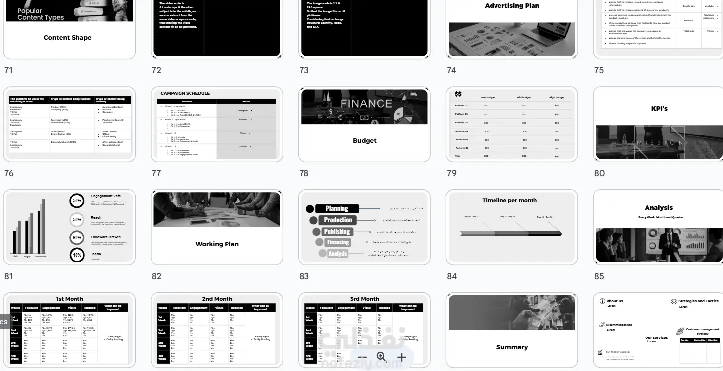 - خطة محتوى وادارة وسائل التواصل الاجتماعي. - دراسة تفصيلية للعملاء المستهدفين. - تقويم شهري متغير حسب متطلبات السوق والشركة. - كافة التفاصيل الخاصة بوضع الشركة ووضع المنافسين. - العمل من خلال تقييم KPI's
