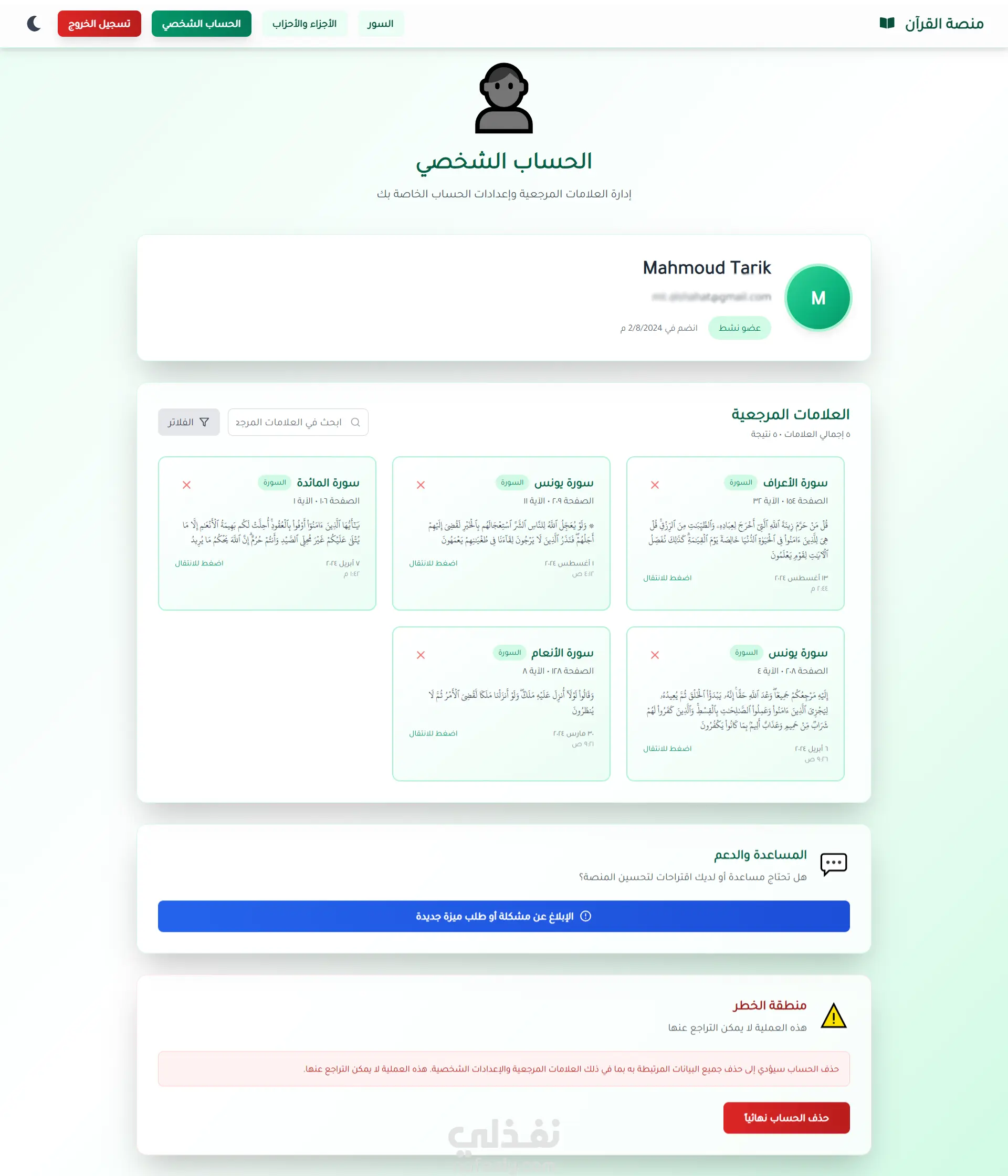 مشروع منصة القرآن KoranRead هو منصة ويب متطورة لقراءة واستماع القرآن الكريم، تم بناؤها باستخدام ReactJS (إطار عمل لبناء واجهات مستخدم تفاعلية). الهدف من المشروع كان تقديم تجربة قراءة رقمية تحاكي المصحف الورقي لكن بمميزات تكنولوجية بتسهل على المستخدم الوصول والتعامل مع المحتوى. الموقع بيتيح القراءة بخطوط مصحف أنيقة ومنظمة حسب الصفحات، الأجزاء، أو الأحزاب، مع توفير خاصية البحث الذكي والشامل في كامل نص القرآن الكريم. كمان بيقدم مجموعة من التفسيرات المختلفة وأصوات لمشهور القراء، بالإضافة لميزة نوعية وهي نطق الكلمة بمجرد الضغط عليها (Word-pronouncer) لمساعدة المستخدم على القراءة الصحيحة. من الناحية التقنية، استخدمت Firebase (منصة سحابية لإدارة البيانات) عشان أسمح للمستخدمين بحفظ مكان القراءة ومزامنتها على السحابة (Cloud-synced)، وده بيخلي المستخدم يقدر يكمل قراءته من أي جهاز تاني بشكل سلس. المشروع بيعتمد كمان على Tailwind CSS (أداة لتنسيق الواجهات) لضمان تصميم عصري وسريع الاستجابة على الموبايل، مع ربط الموقع بـ REST APIs (واجهات برمجة التطبيقات) لجلب المحتوى الصوتي والتفسيرات. التقنيات المستخدمة في المشروع: React.js و JavaScript لبناء المنطق البرمجي. Tailwind CSS و CSS لتصميم واجهة المستخدم. Firebase و NoSQL لإدارة بيانات المستخدمين ومزامنة القراءة. REST APIs لدمج المحتوى الخارجي من تفسيرات وأصوات.