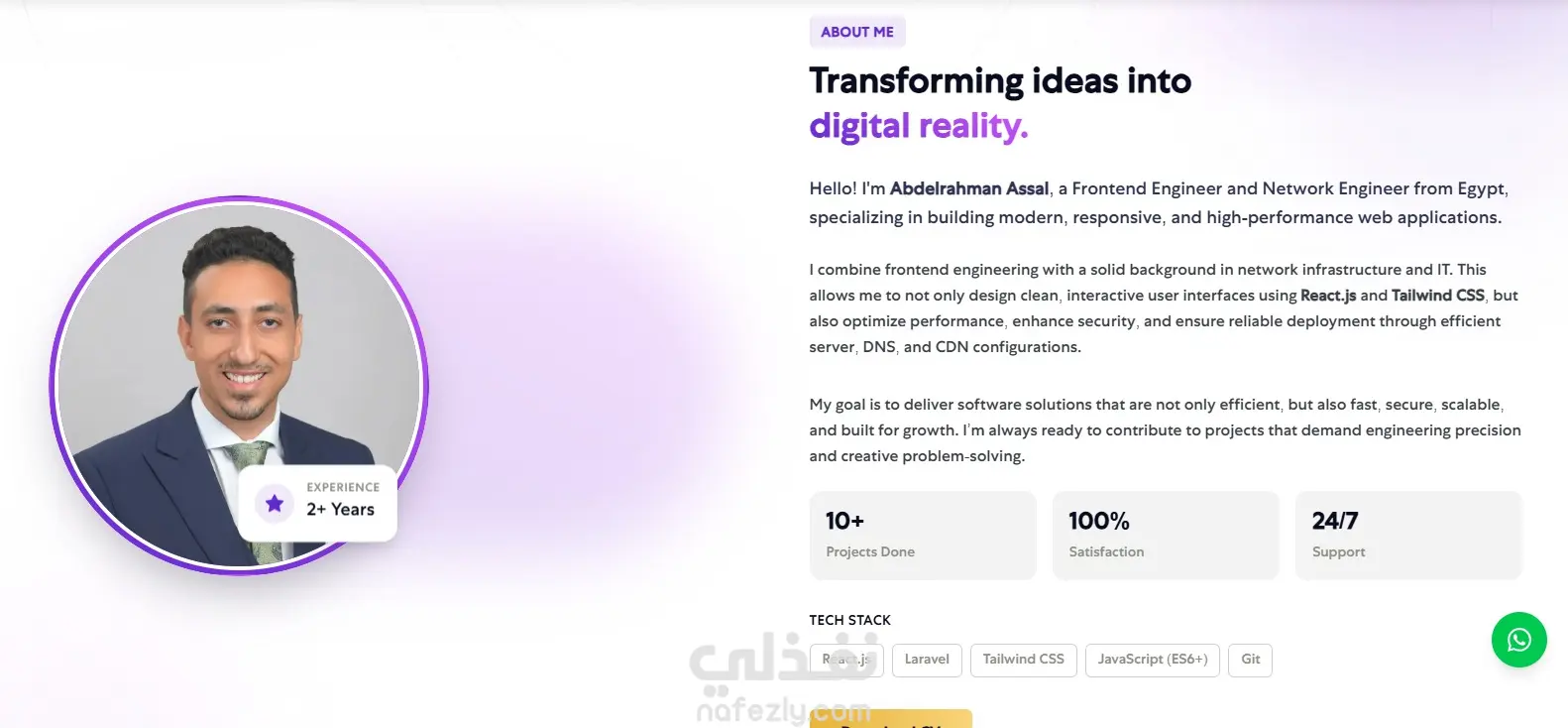 هذا المشروع هو تجسيد حي للحلول الرقمية الحديثة التي أقدمها لعملائي، حيث قمت بتصميم وتطوير موقع شخصي متكامل (Portfolio) ليكون واجهة احترافية تعكس الهوية الرقمية بأعلى معايير الجودة. الهدف من هذا العمل لم يكن مجرد عرض المشاريع، بل تقديم تجربة مستخدم (UX) فريدة وسلسة تثبت قدرتي على تحويل الأفكار إلى واقع تقني ملموس. ما الذي يمثله هذا المشروع لك كعميل مستقبلي؟ عند تصفحك لهذا الموقع، ستلمس بنفسك المعايير التي ألتزم بها في مشاريعي، والتي تشمل: الأداء فائق السرعة: تم بناء الموقع باستخدام تقنية React.js مع Vite لضمان سرعة تحميل لحظية وتنقل سلس بين الصفحات، وهو عامل حاسم في تحسين ترتيب موقعك في محركات البحث (SEO) والحفاظ على زوارك. تصميم عصري ومتجاوب: الاعتماد على Tailwind CSS يضمن أن الموقع يعمل بكفاءة ومظهر جذاب على جميع الأجهزة (هواتف، أجهزة لوحية، وحواسيب)، مما يوسع شريحة عملائك المستهدفة. تجربة مستخدم تفاعلية: تم توظيف مكتبة Framer Motion لإضافة تأثيرات بصرية وحركية ناعمة تجذب الانتباه دون التأثير على الأداء، مما يعطي انطباعاً بالاحترافية والتميز لعلامتك التجارية. ميزات متقدمة: يتضمن الموقع نظاماً لتبديل الوضع الليلي (Dark/Light Mode) لراحة العين، ونموذج تواصل فعال مربوط بخدمة EmailJS لضمان وصول رسائل العملاء مباشرة، وهي ميزات يمكنني تنفيذها في مشروعك الخاص لزيادة التفاعل. هذا العمل هو مثال عملي على الكود النظيف، الهيكلة المنظمة، والاهتمام بأدق التفاصيل الذي ستحصل عليه عند توظيفي لتنفيذ مشروعك القادم. المهارات المستخدمة: React.js - Tailwind CSS - Framer Motion - JavaScript (ES6+) - Responsive Design - UI/UX Implementation