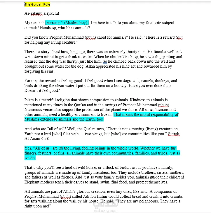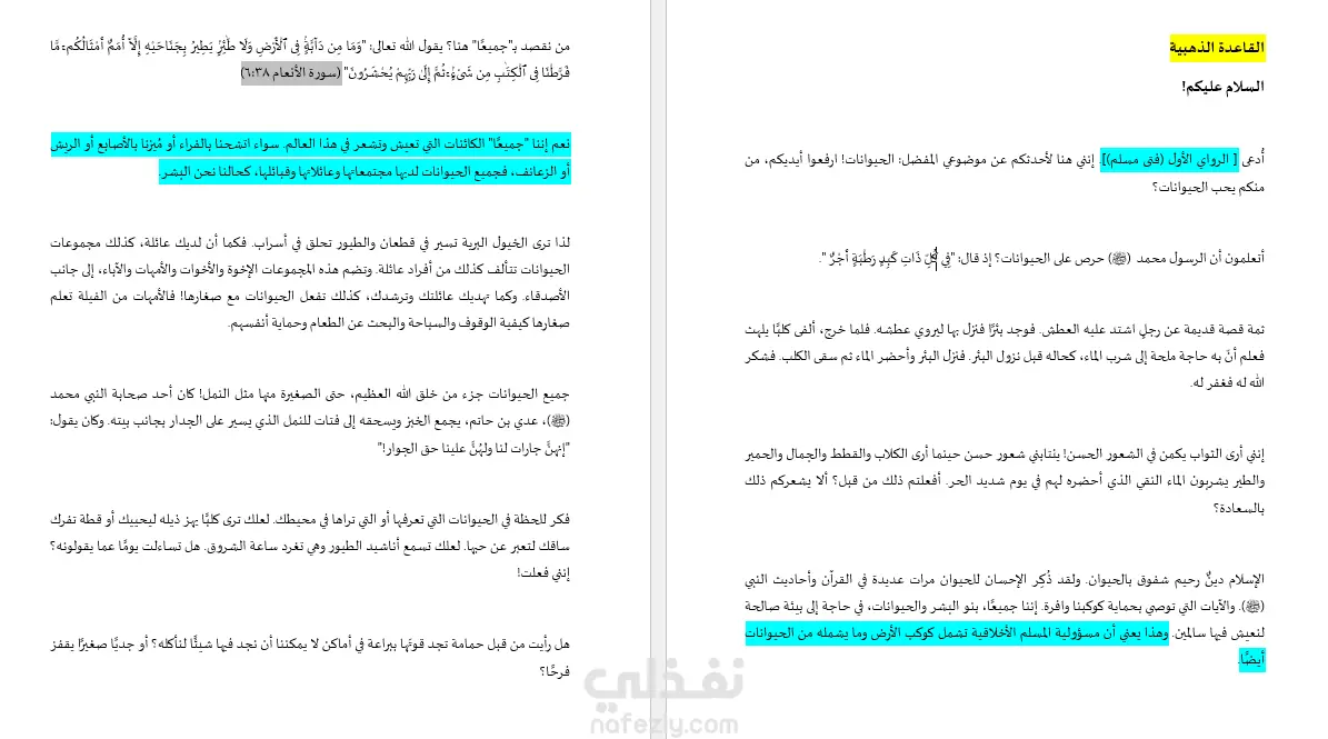حديثٌ موجزٌ يبيّن أن الإحسان إلى الحيوان خُلُقٌ دينيٌّ راسخ، دعا إليه الإسلام، وجعله بابًا من أبواب الأجر والمغفرة؛ إذ الرحمة بكل ذي كبدٍ رطبة عبادة، والسعي إلى سقي الحيوان ورعايته باعثٌ على طيب النفس وصلاح العمل، كما أن حفظ البيئة وصون المخلوقات مسؤولية أخلاقية يشترك فيها الإنسان مع سائر الأحياء.