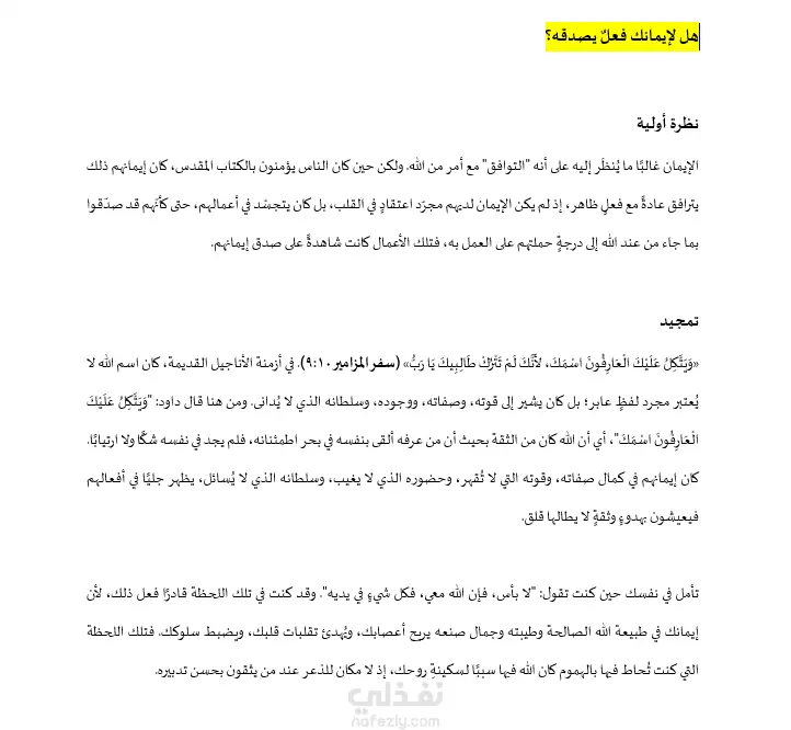 النص التالي ترجمة من أصل إنجليزي، ويتناول العلاقة بين الإيمان والعمل في السياق الديني. يبيّن كيف أن الإيمان لم يكن مجرد اعتقاد داخلي في قلوب المؤمنين، بل كان يُترجَم إلى أفعالٍ ظاهرية، بحيث كانت تلك الأعمال شهادة على صدق الإيمان وامتثاله لما أمر الله به.