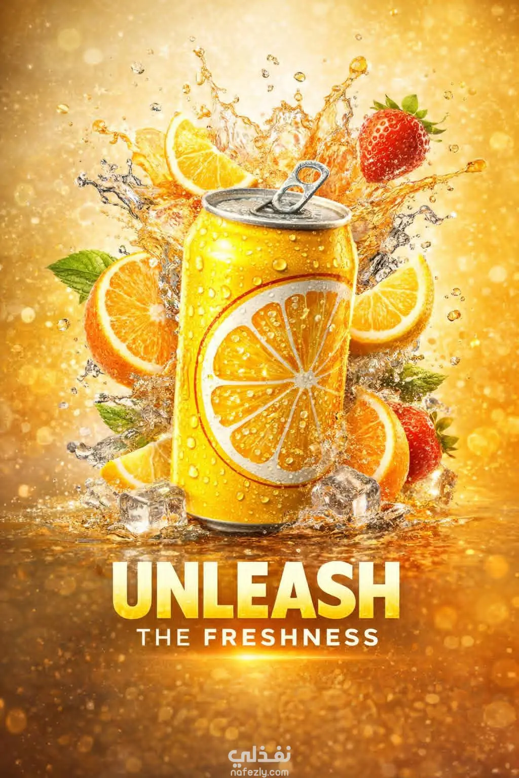 تم تصميم إعلان إبداعي لمشروب غازي بطابع عصري يعكس الانتعاش والحيوية، مع استخدام ألوان دافئة ولمسات بصرية جذابة تُبرز نكهة البرتقال والفراولة. يعتمد التصميم على إبراز المنتج في المنتصف مع تأثيرات المياه والثلج لإيصال إحساس فوري بالانتعاش، مع عبارة تسويقية قوية UNLEASH THE FRESHNESS تعزز من جاذبية الإعلان وتزيد من تأثيره البصري، مما يجعله مناسبًا للحملات الإعلانية ووسائل التواصل الاجتماعي.