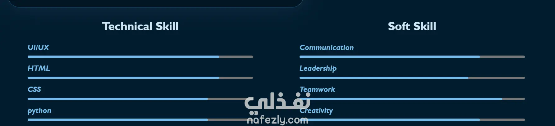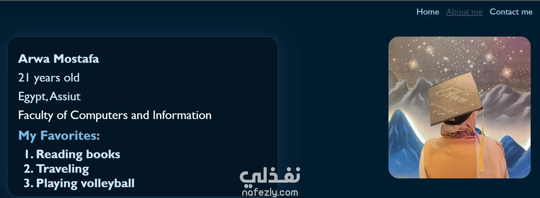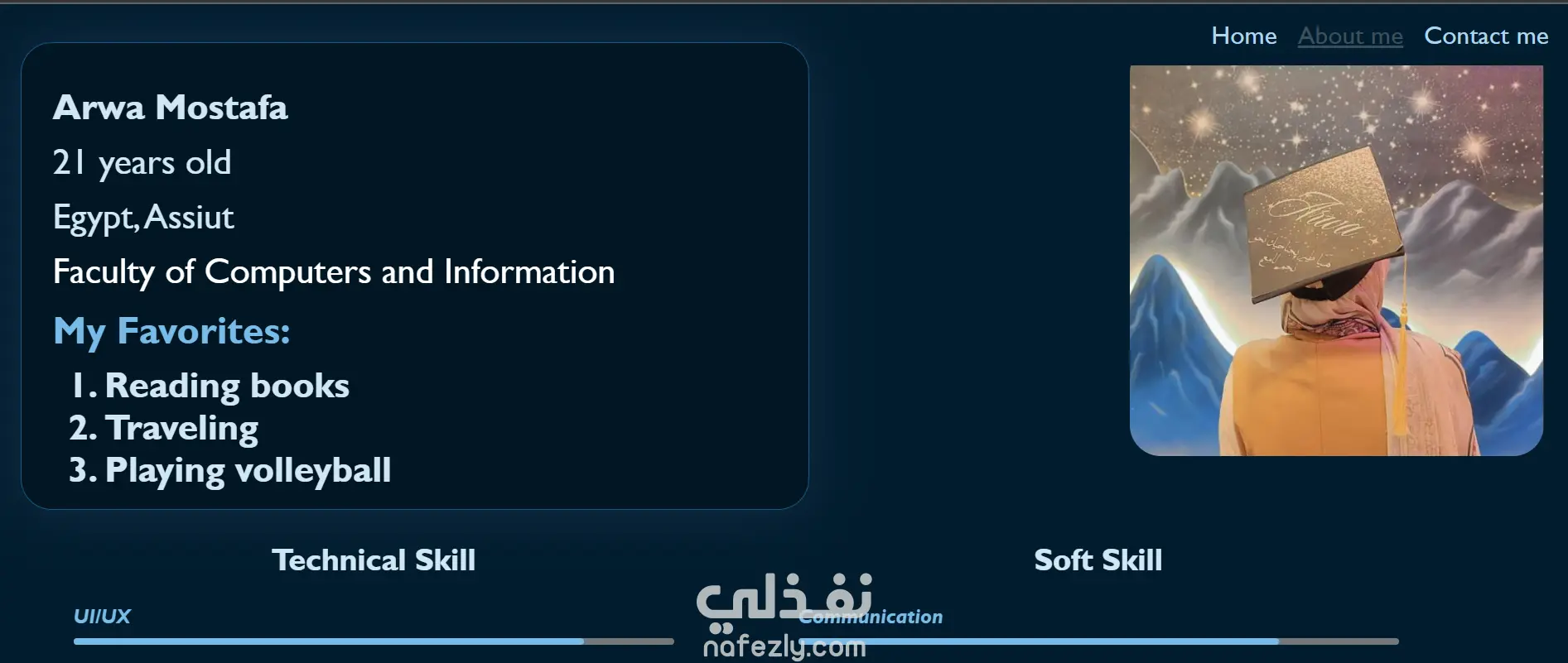 موقع شخصي احترافي باستخدام HTML و CSS قمت بتصميم وتطوير موقع شخصي متكامل متعدد الصفحات باستخدام HTML وCSS فقط، يهدف إلى عرض المعلومات الشخصية والمهارات بشكل أنيق ومنظم. الموقع يتكوّن من 3 صفحات رئيسية (Home – About Me – Contact) مع شريط تنقّل ثابت يسهّل التنقل بين الصفحات. ركزت في التصميم على: واجهة مستخدم بسيطة وحديثة بألوان متناسقة. تنظيم المحتوى بطريقة واضحة وسهلة القراءة. تصميم متجاوب يناسب مختلف أحجام الشاشات. استخدام تأثيرات CSS مثل الظلال، الشفافية، وBlur لإضفاء لمسة احترافية. عرض المهارات التقنية والشخصية بطريقة مرئية باستخدام Skill Bars. الموقع مناسب كنموذج Portfolio شخصي أو صفحة تعريفية لأي شخص يرغب في عرض معلوماته وخبراته بشكل احترافي على الويب.