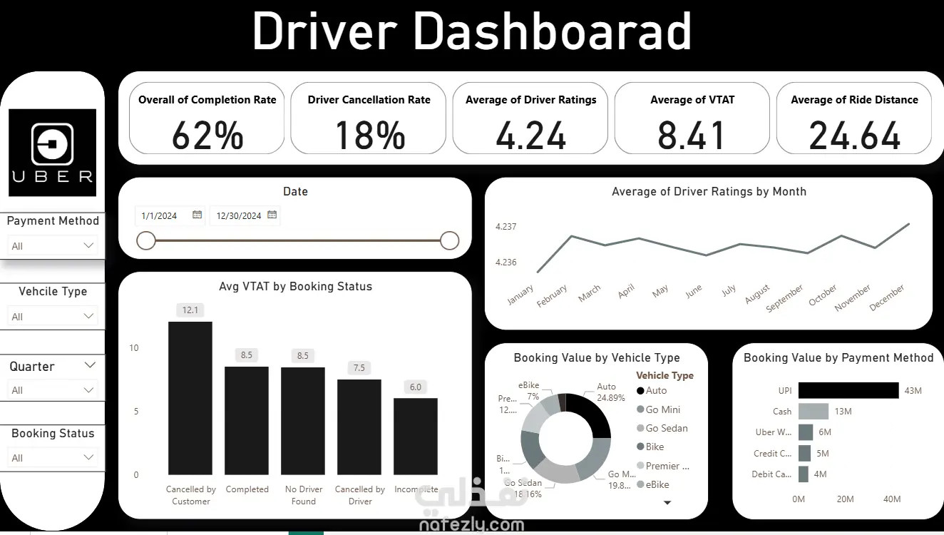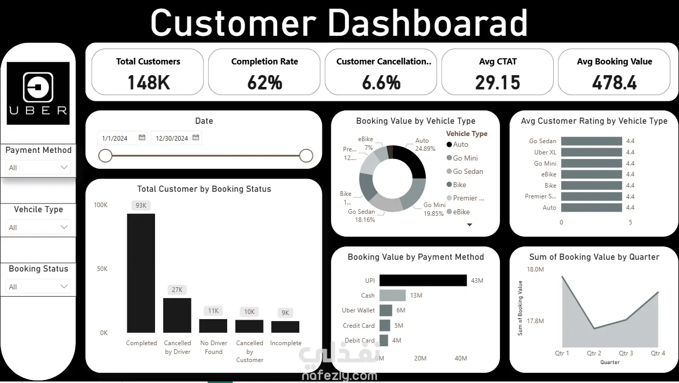 قمت بتنفيذ مشروع تحليل بيانات Uber بهدف فهم سلوك الرحلات وتحسين الأداء التشغيلي من خلال تحويل البيانات الخام إلى مؤشرات أداء واضحة وDashboards تفاعلية. تفاصيل المشروع: تنظيف وتجهيز بيانات رحلات Uber لضمان دقة التحليل. استخدام Python لمعالجة البيانات وتحليلها. تحليل البيانات لاستخراج Insights مثل: عدد الرحلات نسب الرحلات المكتملة والملغاة سلوك العملاء والسائقين أوقات الذروة والاتجاهات الزمنية إنشاء Dashboards احترافية باستخدام Power BI** لعرض النتائج بشكل مبسط وسهل الفهم. تقسيم التحليل إلى: Customer Dashboard Driver Dashboard ربط النتائج بمؤشرات أداء (KPIs) تساعد في اتخاذ قرارات تشغيلية أفضل