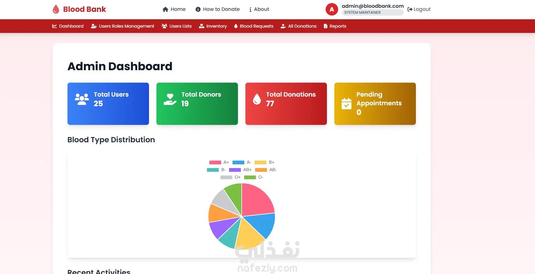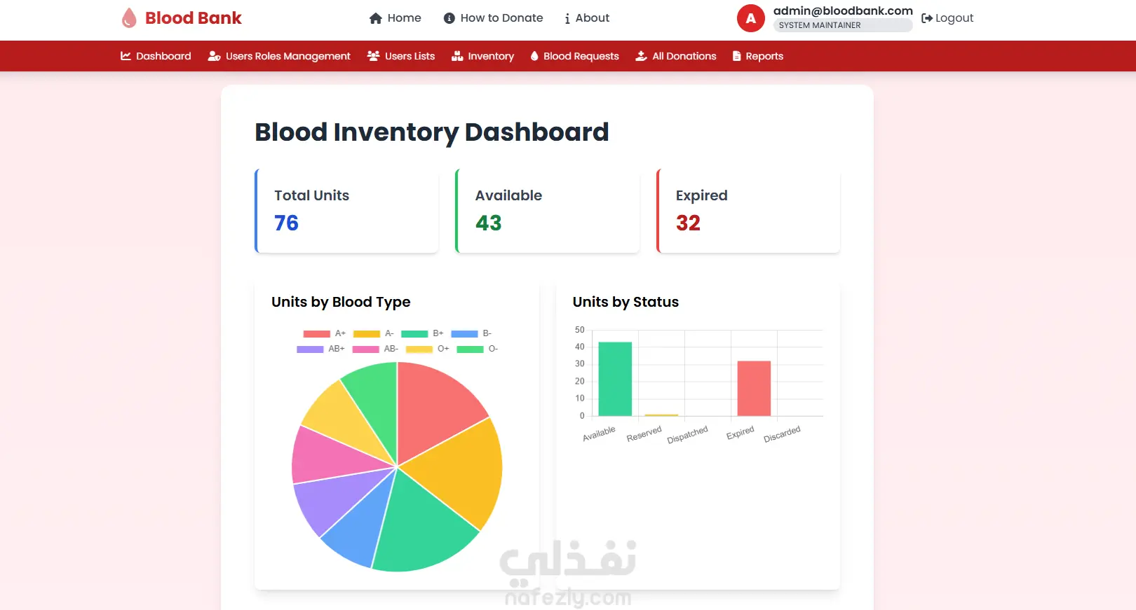 رسوم بيانية تفاعلية (Charts) توضح توزيع فصائل الدم وحالة المخزون.