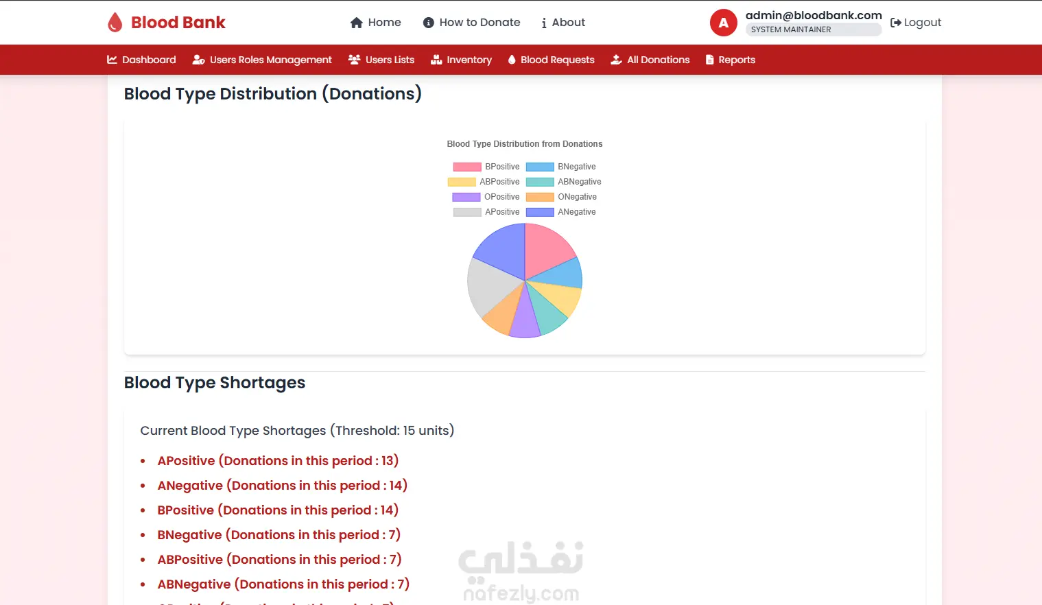 نظام تنبيهات ذكي للنقص (Blood Type Shortages) يعتمد على حد أدنى (Threshold) يتم تحديده مسبقاً (مثلاً: أقل من 15 وحدة).
