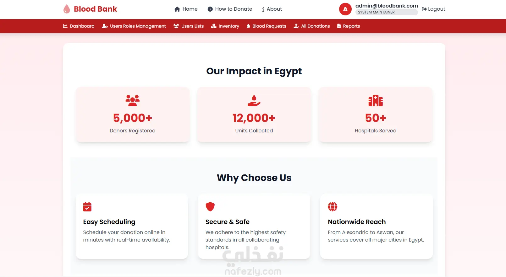 تم تطوير هذا النظام ليكون حلاً سحابياً متكاملاً لإدارة عمليات بنوك الدم، بهدف تسهيل الربط بين المتبرعين والمستشفيات وإدارة المخزون بكفاءة عالية. يهدف النظام إلى رقمنة عملية التبرع بالكامل، بدءاً من تسجيل المتبرع وجدولة المواعيد، وصولاً إلى إدارة المخزون وإصدار التقارير التحليلية، مما يساهم في إنقاذ الأرواح عبر تسريع الإجراءات وتقليل الأخطاء البشرية.