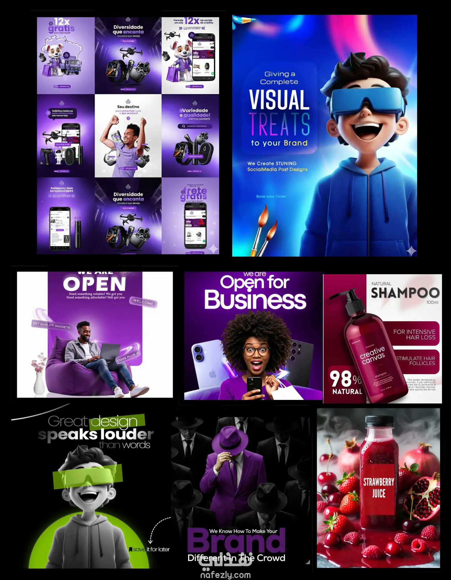 بوستات وإعلانات جذابة تساعد على زيادة التفاعل وتعبر عن البراند بشكل احترافي، مع مراعاة المقاسات المناسبة لكل منصة.