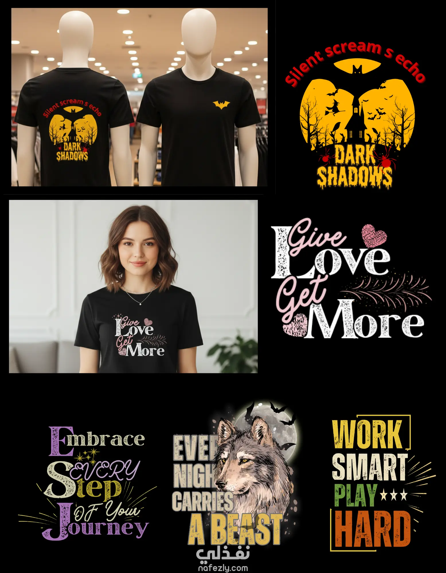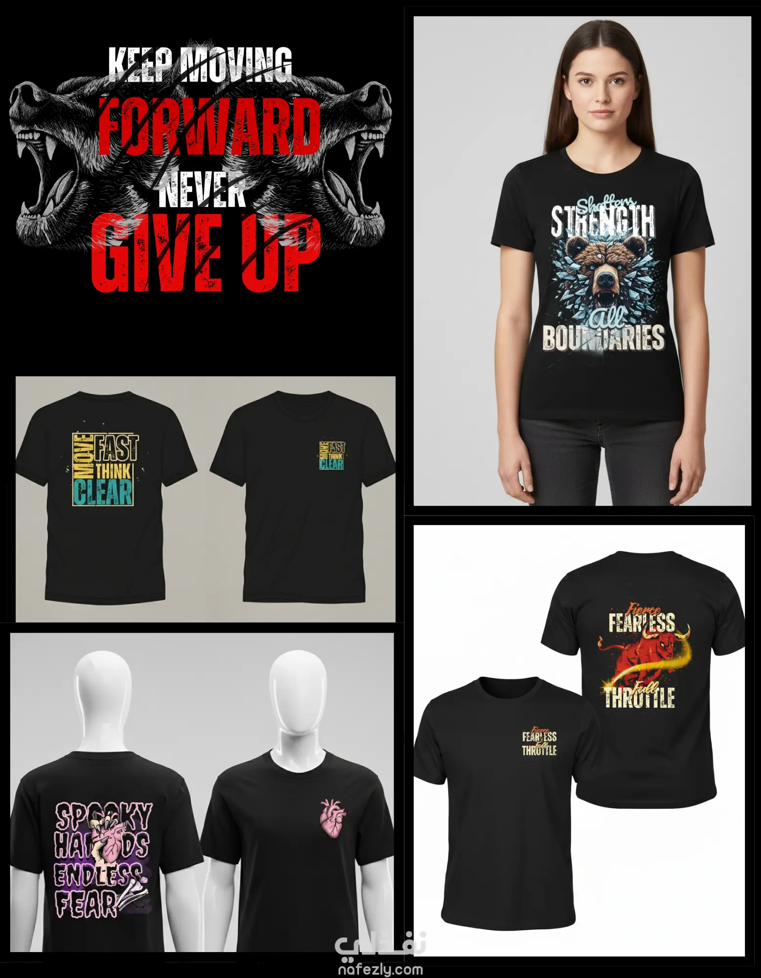 تصميمات تيشيرتات عصرية تناسب الطباعة، مع الاهتمام بالتفاصيل والألوان وجودة الشكل النهائي.