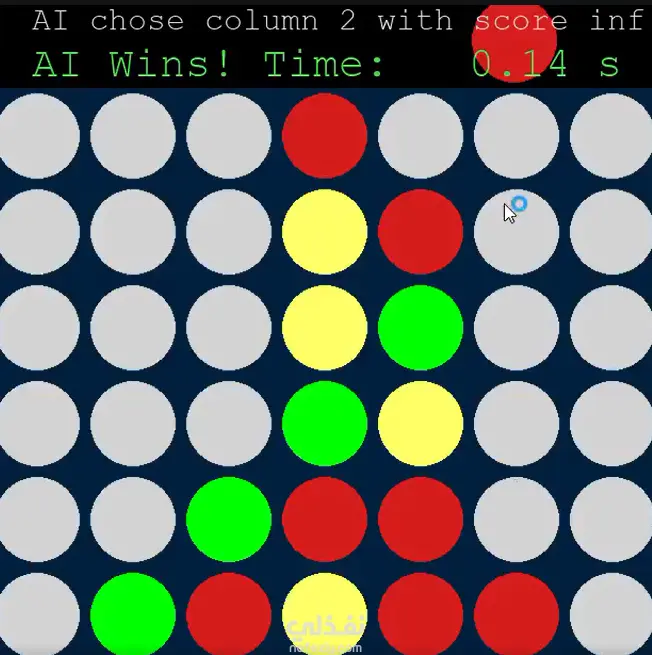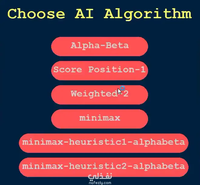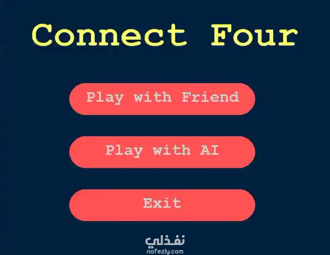 an intelligent AI-based Connect Four game. implemented it using Python, with the GUI built in Pygame. The game offers two modes: play with a friend or play against the AI. If you choose to play against the AI, you can select from different AI strategies and decide the difficulty level—Easy, Medium, or Hard After finishing the game, it displays the winner and the average time the AI took to calculate the best move for each turn during the game.