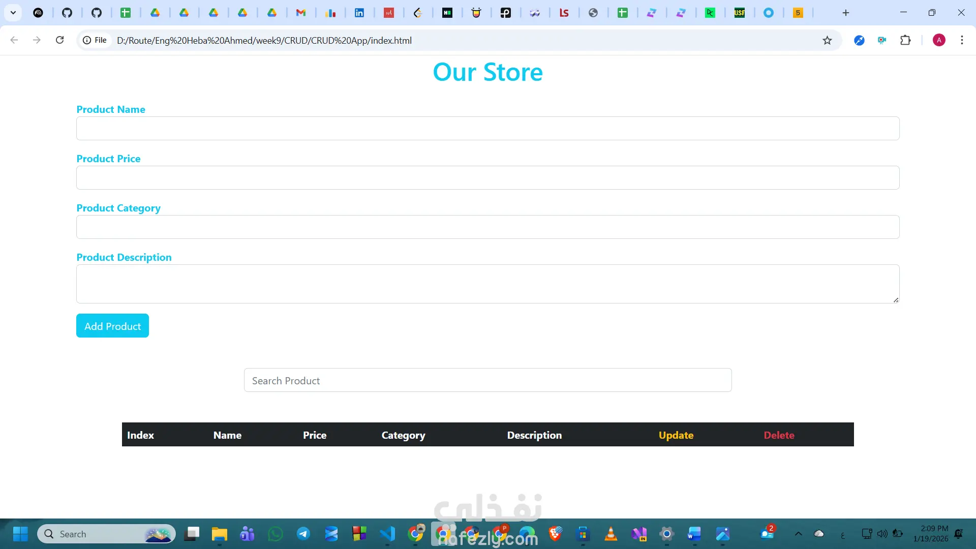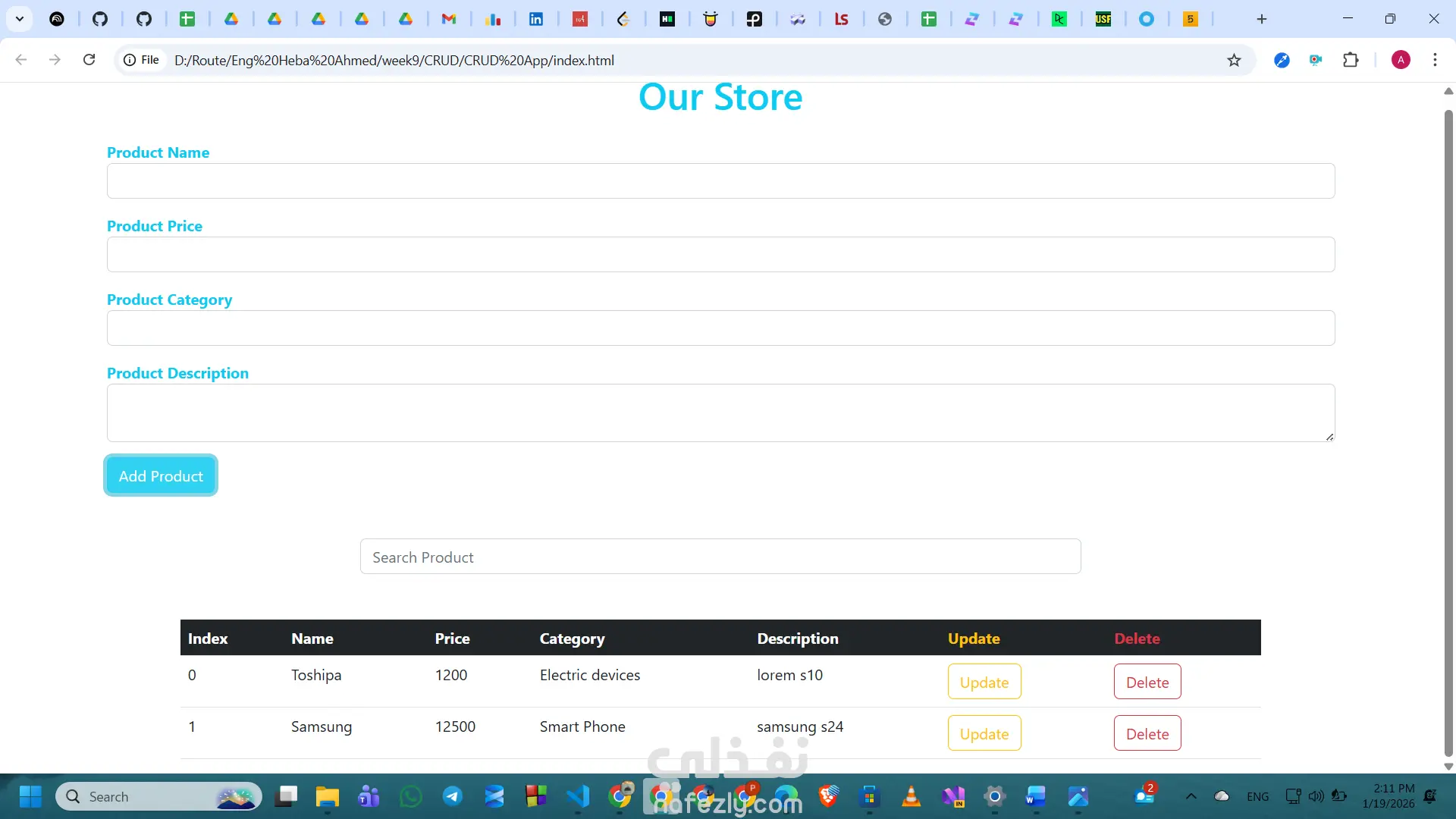 تطبيق ويب لإدارة المنتجات يعتمد على مفهوم CRUD Operations (Create, Read, Update, Delete)، يتيح إضافة المنتجات، تعديلها، حذفها، وعرضها داخل جدول منظم مع إمكانية البحث الفوري.