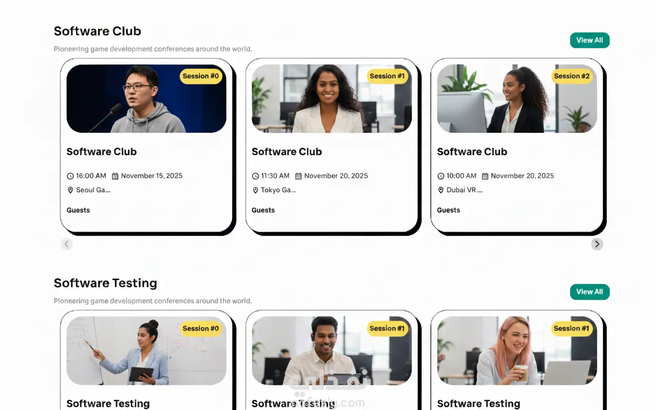 إدارة واستكشاف الفعاليات مع صفحات تفصيلية، متحدثين، تسجيلات، وتقييمات بعد الحدث.