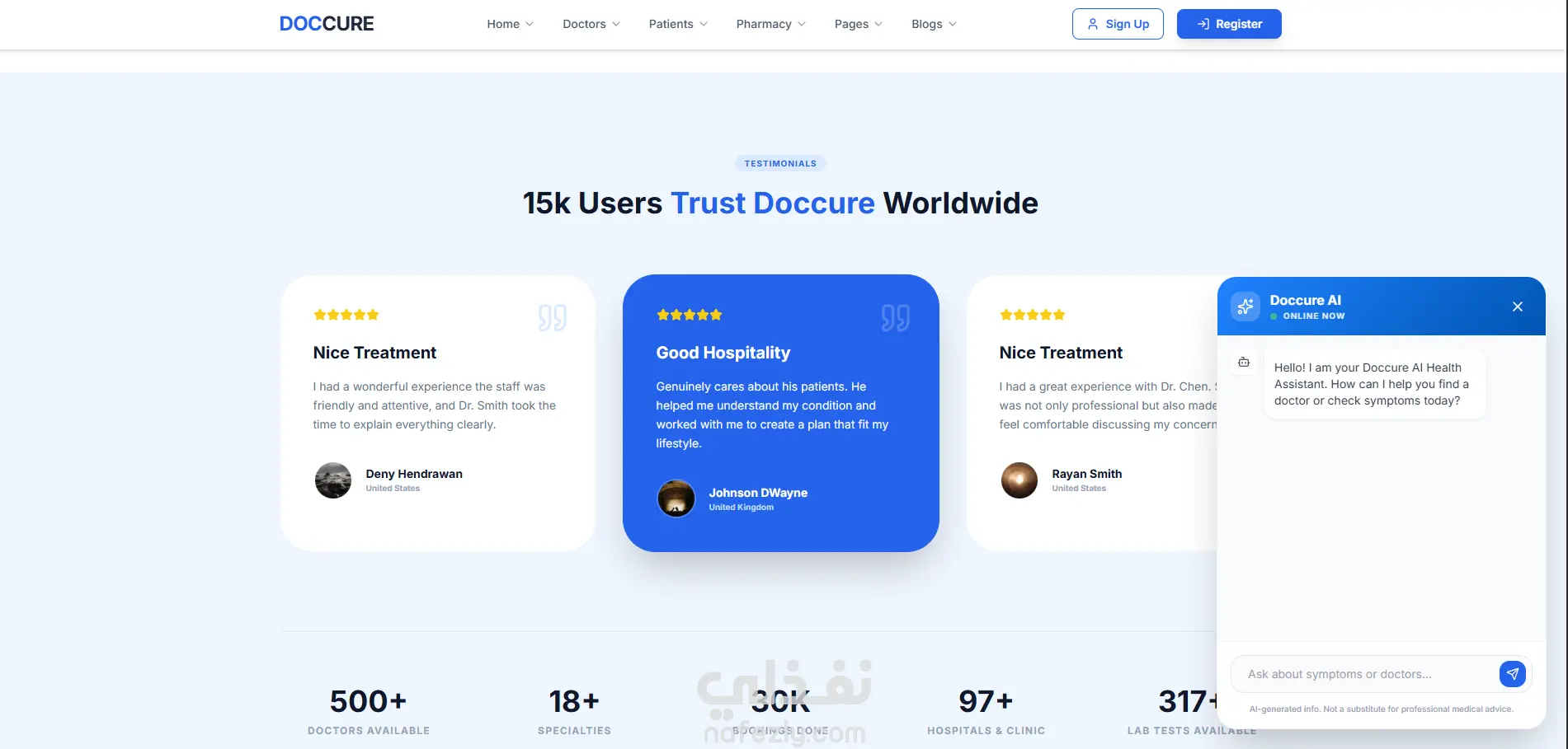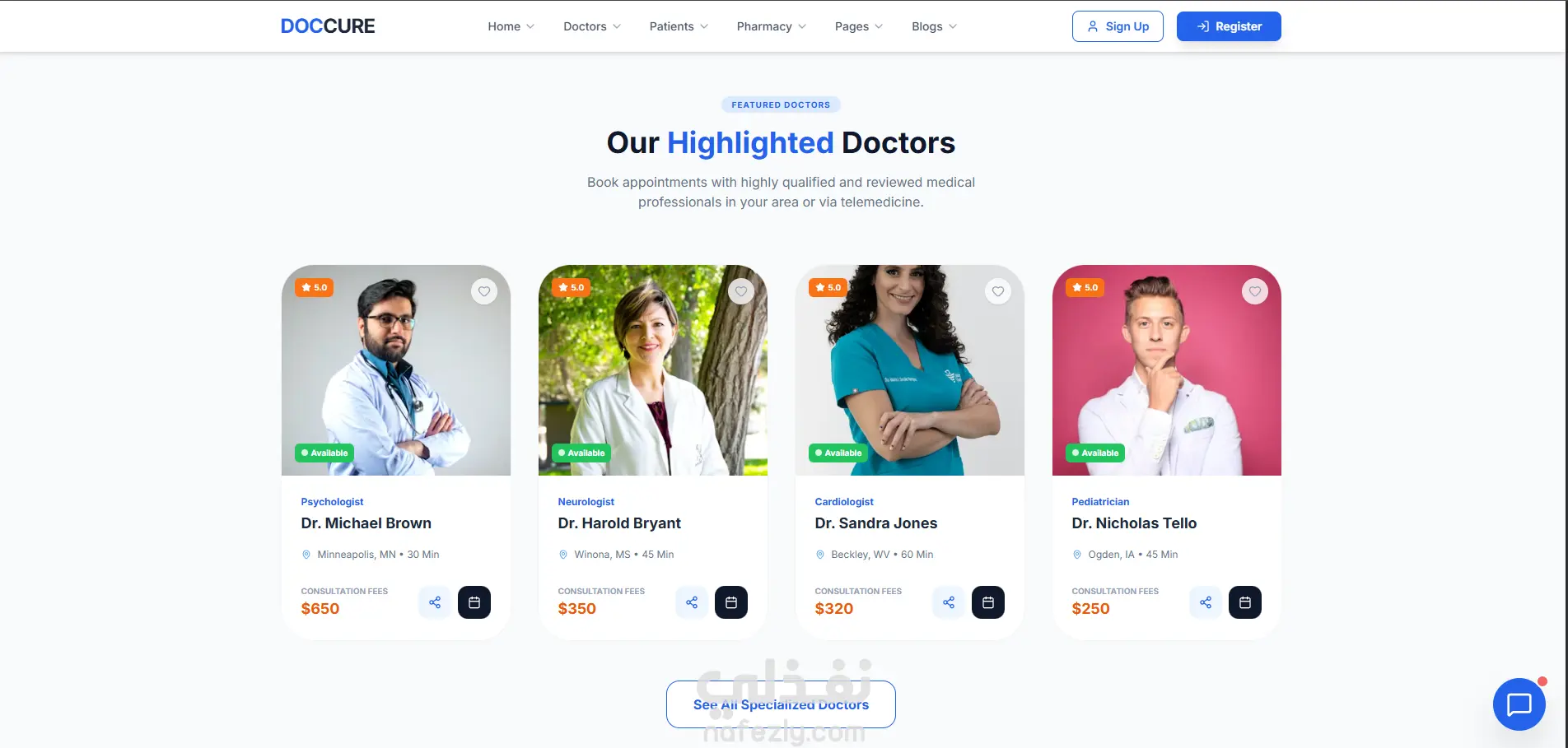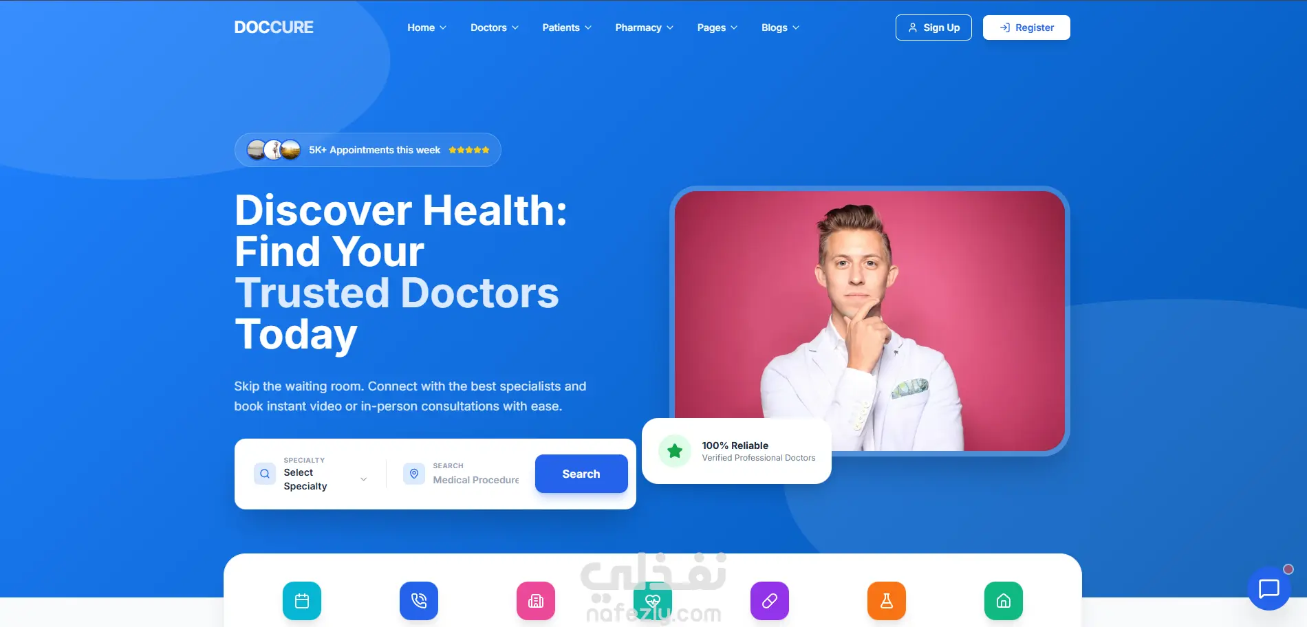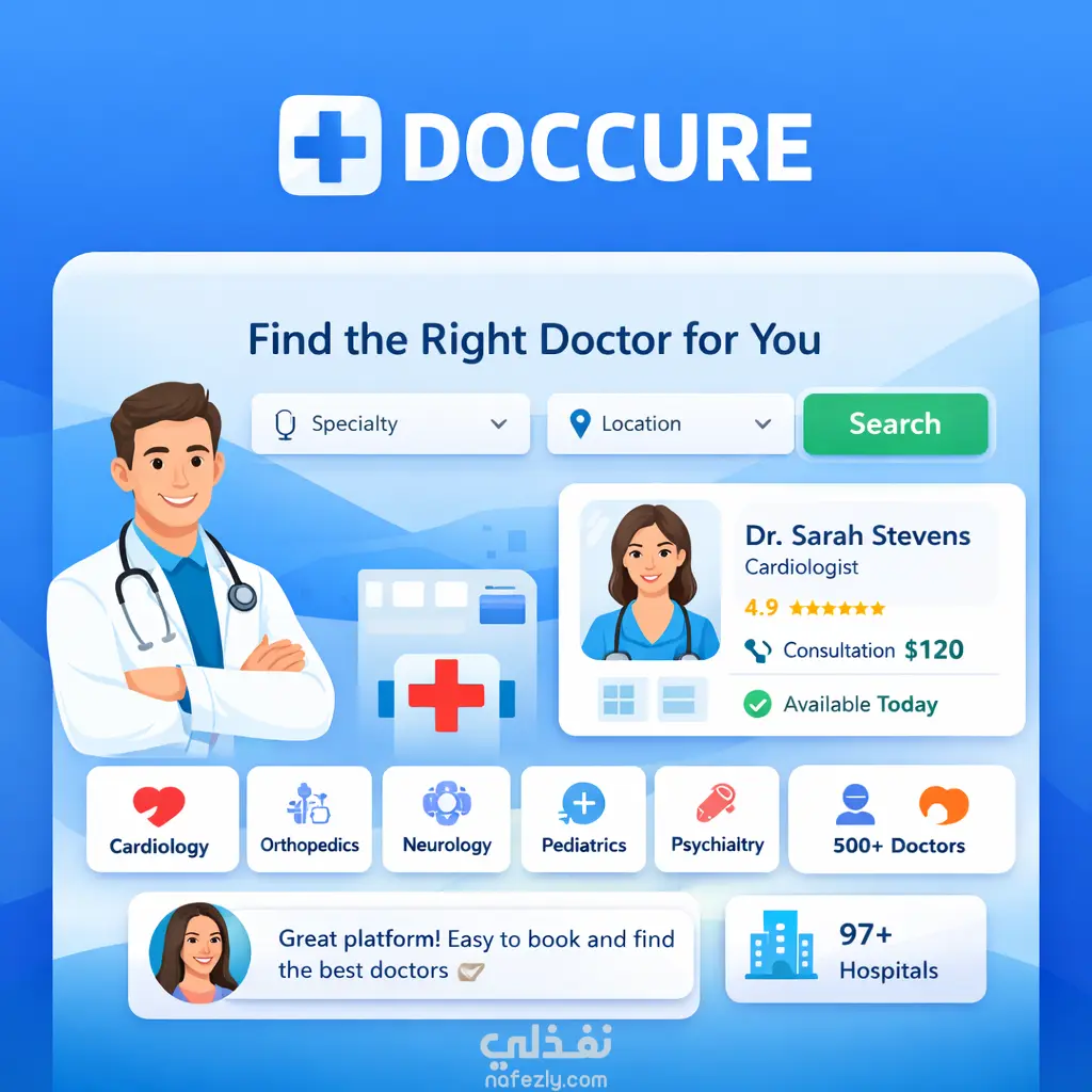DOCCURE – تصميم واجهة منصة طبية حديثة لحجز الأطباء عن بُعد
