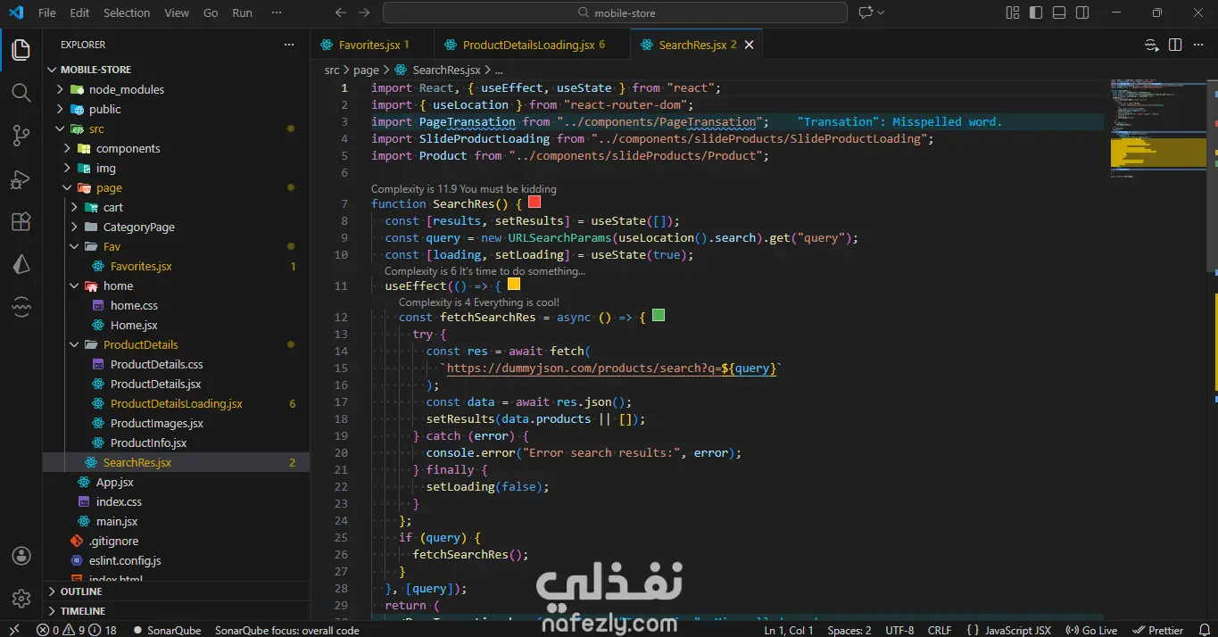 • نظام بحث وتصنيف ذكي: يحتوي الموقع على شريط بحث (Search Bar) فعال للبحث عن منتجات معينة (مثل اللابتوب)، بالإضافة إلى إمكانية تصفح المنتجات حسب الفئات المتاحة من الـ API.