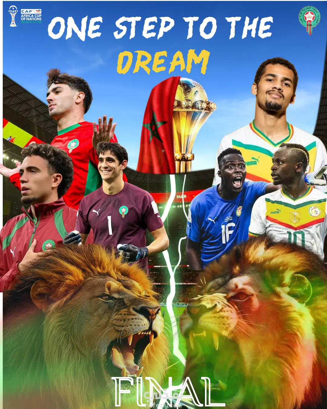 تصميم رياضي ملحمي يعبّر عن قمة التحدي والطموح في نهائي كأس أمم إفريقيا، حيث يلتقي أسود الأطلس بخصمهم في معركة كروية فاصلة لا يفصلها عن الحلم سوى خطوة واحدة. الكأس الإفريقية تتوسط المشهد رمزًا للمجد، بينما تجسّد وجوه اللاعبين والأسود روح القتال، العزيمة، والشغف. تصميم يعكس القوة، التاريخ، والحلم الجماعي، مثالي للبوسترات الرسمية، الصور المصغّرة، والحملات الرياضية الكبرى.