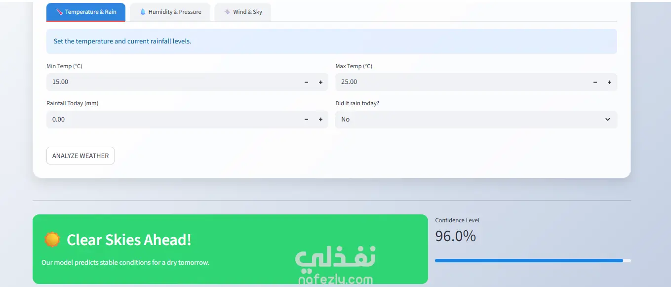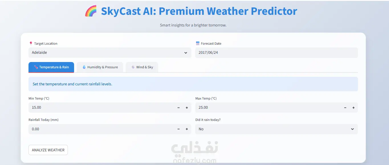 SkyCast AI هو نظام تعلم آلي متكامل مصمم للتنبؤ بسقوط الأمطار في أستراليا. يعتمد المشروع على معالجة وتنظيف البيانات الجوية وبناء نموذج Random Forest مدعّم بميزات مُهندسة بعناية، لتحويل البيانات الخام إلى نتائج واضحة يمكن الاعتماد عليها في اتخاذ القرار. يوفّر النظام واجهتين: لوحة تحكم تحليلية لعرض البيانات والأنماط الجوية بشكل تفاعلي تطبيق تنبؤ فوري يتيح إدخال القيم والحصول على التوقع مباشرة المشروع جاهز للاستخدام العملي وقابل للتوسع، مع التركيز على سهولة الاستخدام ودقة النتائج.