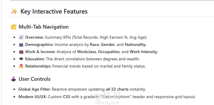 هذا المشروع عبارة عن لوحة تفاعلية متقدمة لتحليل البيانات السكانية والدخل، تهدف إلى تحديد العوامل الرئيسية التي تؤثر على الإمكانيات المالية العالية (دخل أكثر من 50 ألف دولار سنويًا). تحوّل اللوحة البيانات الخام من تعداد السكان إلى 22 تصورًا تفاعليًا يتيح للمستخدمين استكشاف العلاقات بين التعليم، الوظائف، والديموغرافيا بطريقة واضحة وشيّقة. أهم المميزات: تحليل الفجوات بين الجنسين والدخل عبر المستويات التعليمية استكشاف تأثير التعليم والوظيفة على الدخل تصورات تفاعلية للعرق، الجنس، الحالة الاجتماعية، وساعات العمل إمكانية تصفية البيانات حسب العمر لتحديث كل المخططات فورًا واجهة حديثة وجذابة باستخدام Glassmorphism وتصميم متجاوب الهدف: تمكين المستخدمين من فهم العوامل الاجتماعية والاقتصادية المؤثرة على الدخل واتخاذ قرارات مستندة إلى بيانات دقيقة.