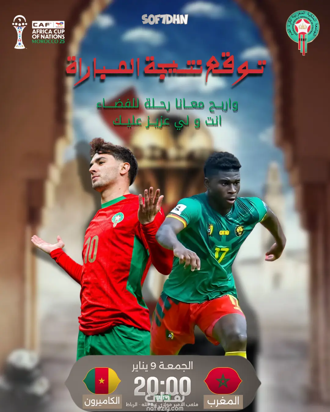 بوستر تفاعلي خاص بمباراة المغرب والكاميرون ضمن كأس أمم إفريقيا، يدعو المتابعين للمشاركة بتوقّع نتيجة اللقاء والفوز بجائزة مميّزة. يجمع التصميم بين الحماس الكروي والطابع التحفيزي، مع إبراز نجوم المنتخبين وأجواء البطولة الإفريقية في خلفية ملحمية. ألوان قوية، توزيع بصري متوازن، ورسالة مباشرة تشجّع التفاعل، ما يجعله مثاليًا لمنشورات السوشيال ميديا وصفحات الجماهير الرياضية.