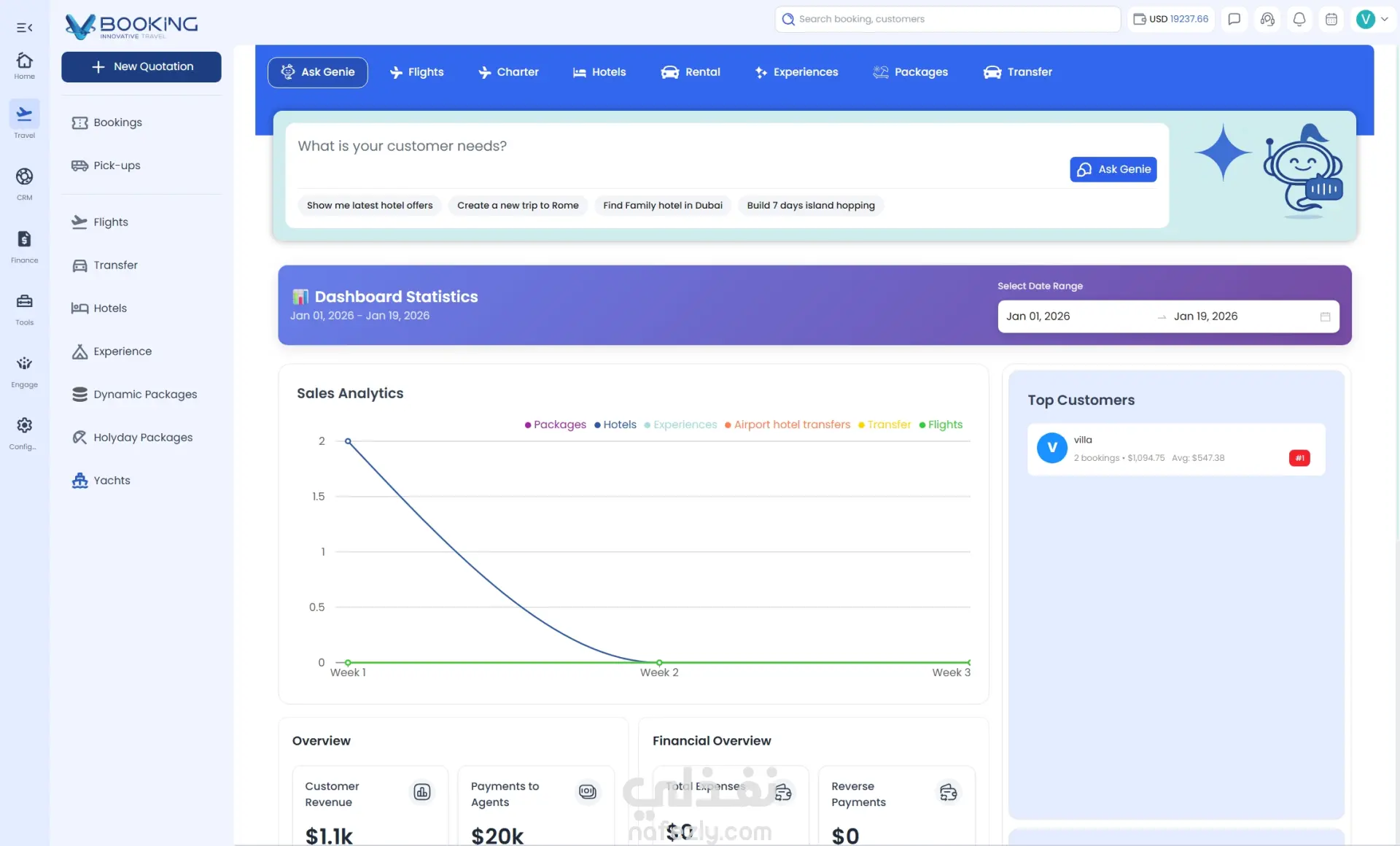 vbooking: نظام سحابي متكامل (SaaS) لإدارة شركات السياحة والسفر vbooking هو منصة تقنية متطورة مصممة خصيصاً لتمكين شركات السياحة من إدارة عملياتها بالكامل في بيئة سحابية واحدة. يهدف النظام إلى رقمنة قطاع السفر من خلال توفير أدوات لإدارة الخدمات السياحية، الربط مع الموردين العالمي، وتنظيم العمليات المالية بدقة. المميزات الأساسية للنظام: إدارة شاملة للموارد: يتيح النظام للمستخدمين إضافة وإدارة قاعدة بيانات خاصة بالفنادق، الرحلات الجوية، التجارب السياحية، وتأجير السيارات. الربط مع الموردين الخارجيين: يدعم النظام التكامل والربط الآلي (API Integration) مع كبار الموردين العالميين مثل TBO Holidays، مما يوسع نطاق الخيارات المتاحة للحجز الفوري. نظام مالي متكامل: معالجة البيانات المالية، إصدار الفواتير، ومتابعة الكشوفات الحسابية لضمان دقة العمليات التجارية. تعدد الصلاحيات والأدوار: تم تصميم النظام ليدعم هيكلية عمل مرنة تشمل: شركة الإدارة (DMC): الحساب الرئيسي الذي يربط الموردين بالوكلاء ويشرف على كافة العمليات. الموردين (Suppliers): لإدراج خدماتهم من فنادق ورحلات بشكل مباشر. الوكلاء (Agents): للبحث وإتمام عمليات الحجز للعملاء النهائيين.