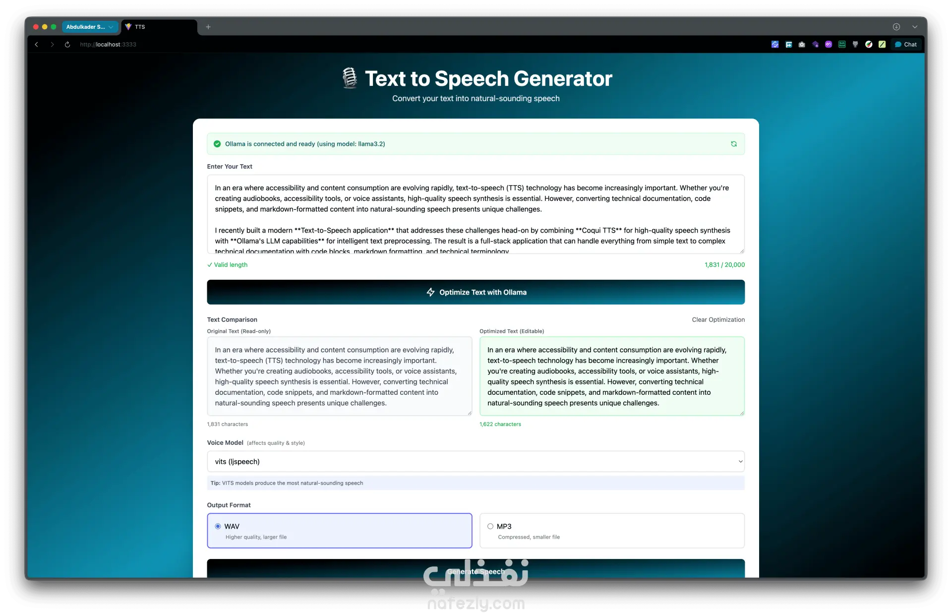 In an era where accessibility and content consumption are evolving rapidly, text-to-speech (TTS) technology has become increasingly important. Whether you're creating audiobooks, accessibility tools, or voice assistants, high-quality speech synthesis is essential. However, converting technical documentation, code snippets, and markdown-formatted content into natural-sounding speech presents unique challenges. I recently built a modern Text-to-Speech application that addresses these challenges head-on by combining Coqui TTS for high-quality speech synthesis with Ollama's LLM capabilities for intelligent text preprocessing. The result is a full-stack application that can handle everything from simple text to complex technical documentation with code blocks, markdown formatting, and technical terminology. In this article, I'll walk you through the architecture, implementation details, and key learnings from building this project.