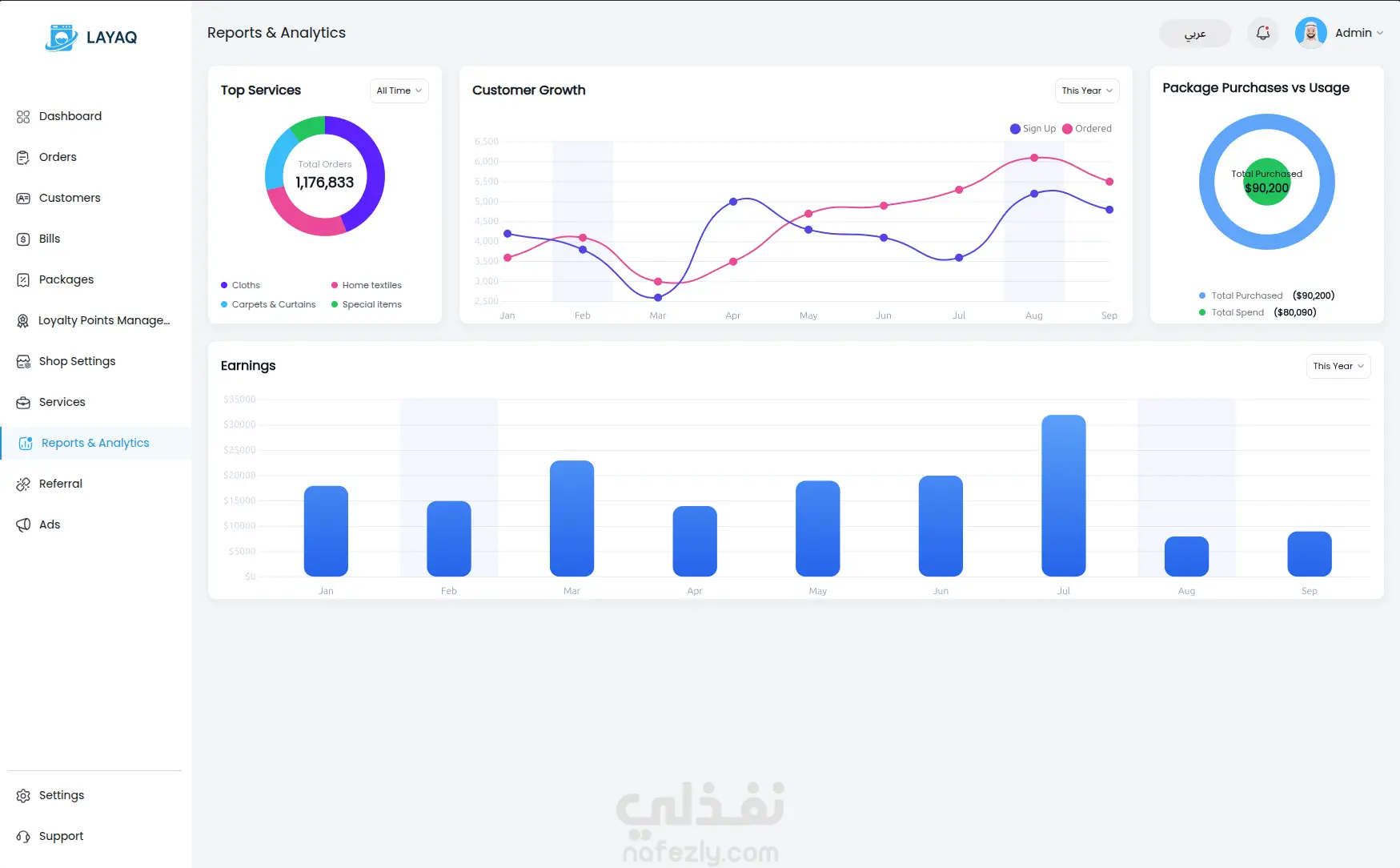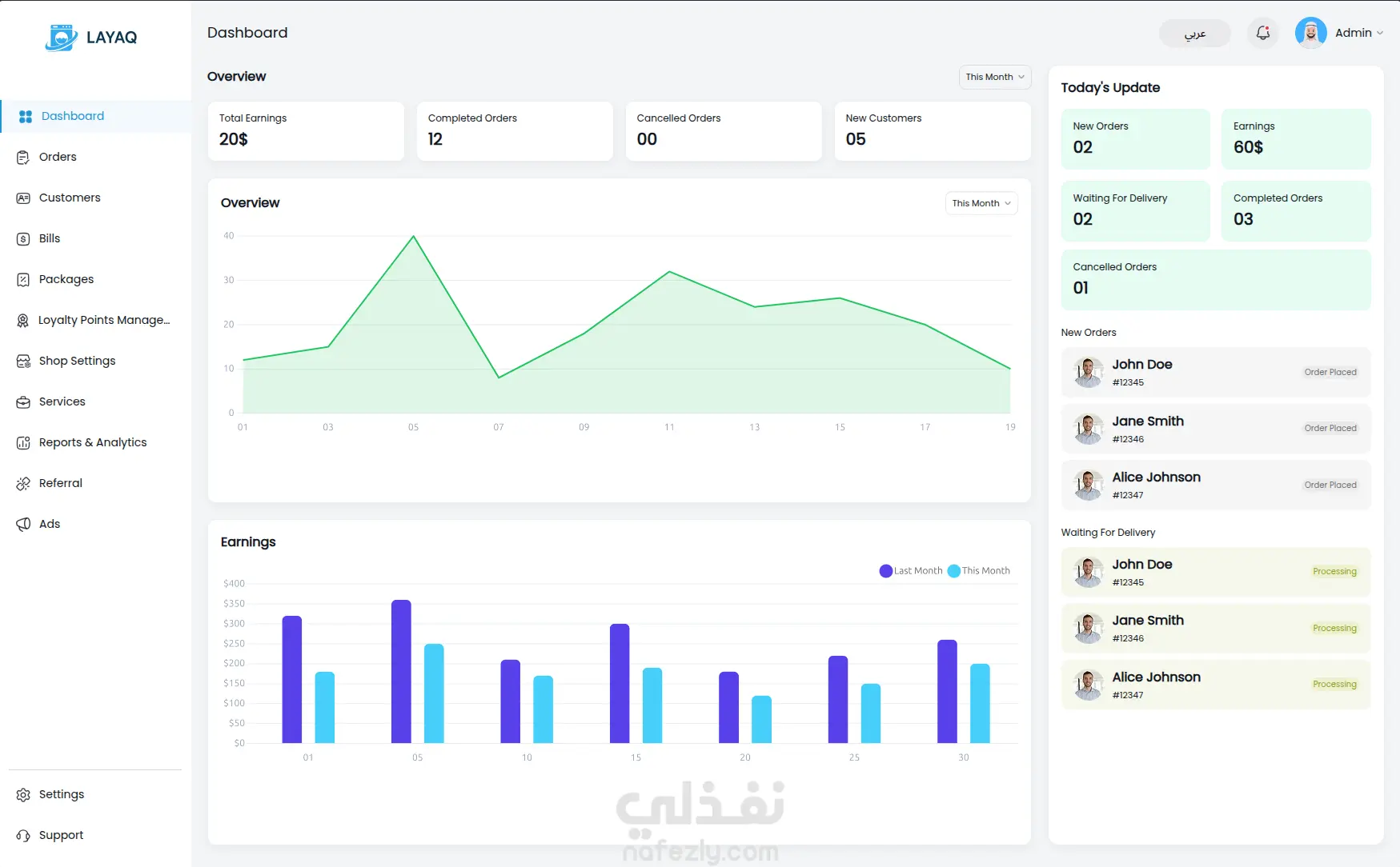 - عرض إحصائيات فورية (عدد الطلبات، الإيرادات، العملاء الجدد)