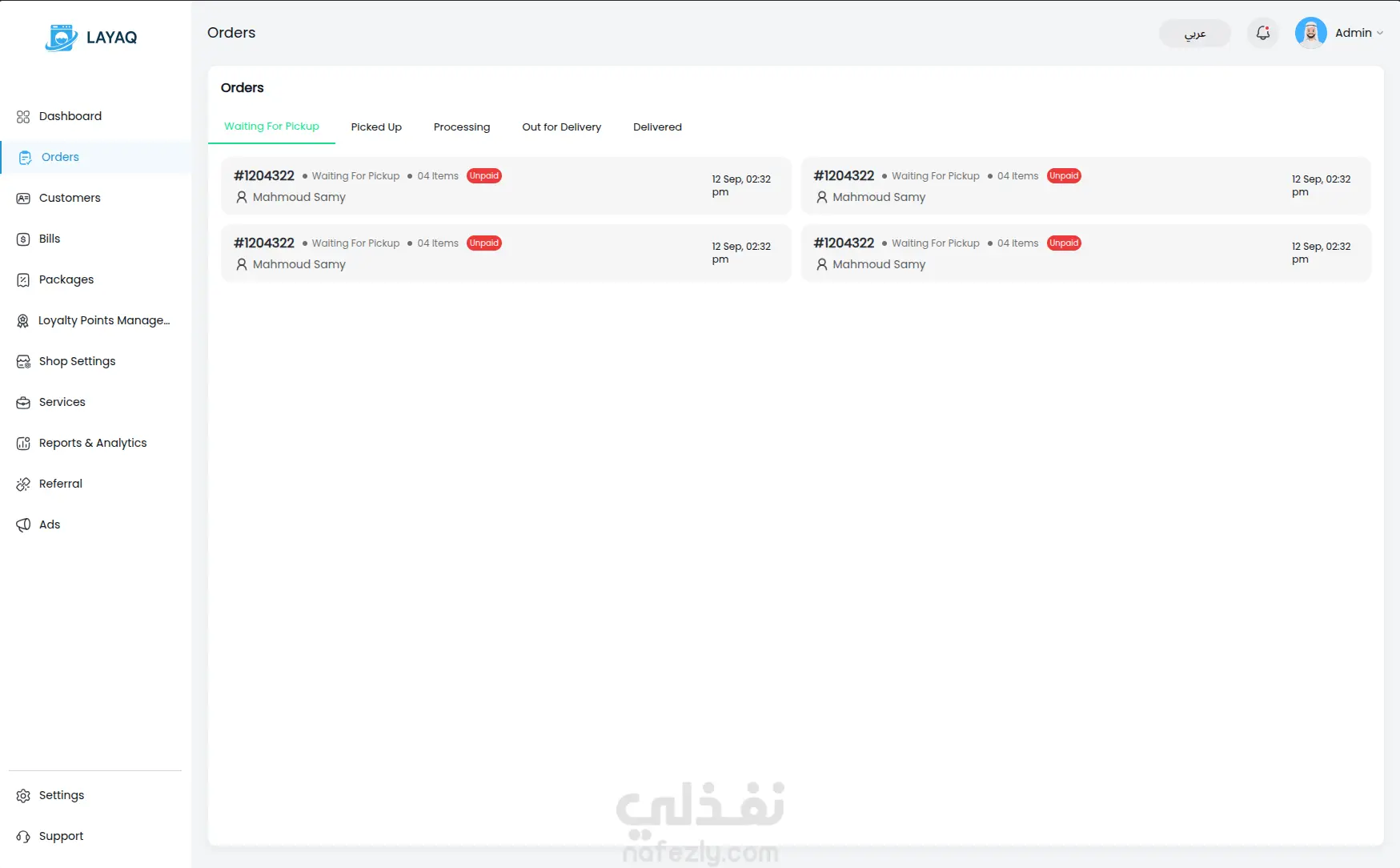 قمت بتصميم وتطوير منصة إدارة متكاملة لمغاسل الملابس (Laundry Management Dashboard) موجهة لأصحاب المغاسل لإدارة أعمالهم اليومية بشكل احترافي وفعّال من خلال واجهة ويب حديثة وسهلة الاستخدام.