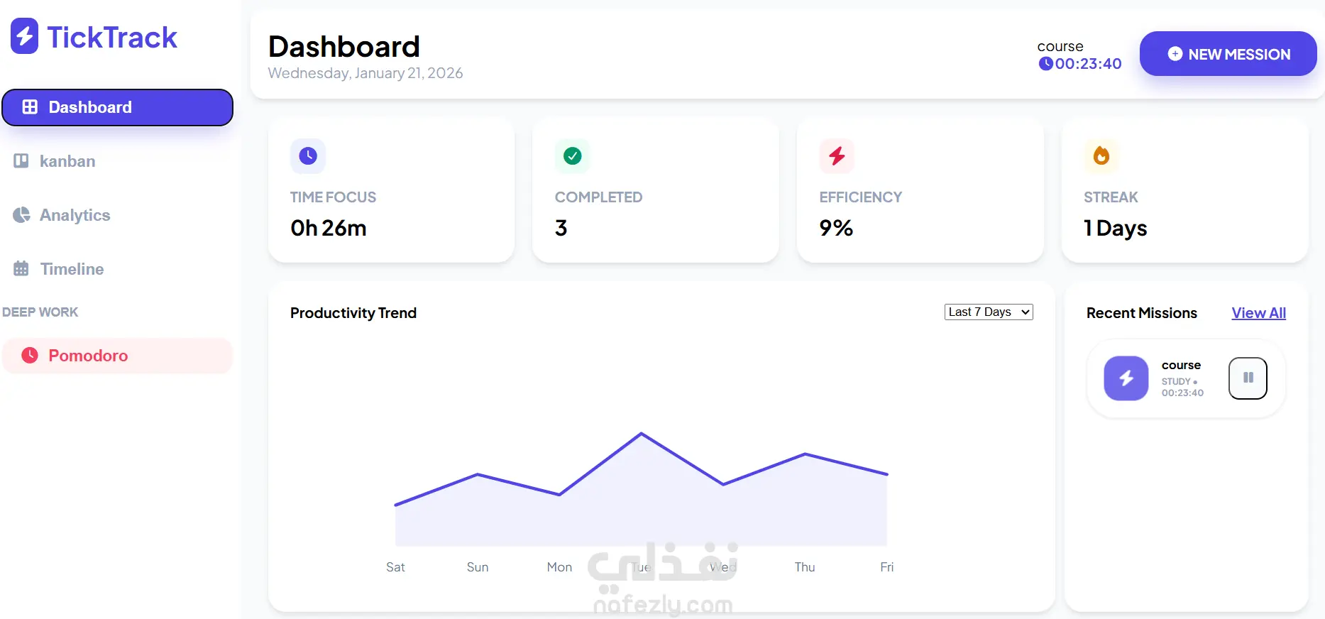 لوحة بيانات (Dashboard) ذكية: عرض مؤشرات الأداء الرئيسية (KPIs) مثل "ساعات التركيز"، "عدد المهام المكتملة"، و"معدل الكفاءة"، بالإضافة إلى تتبع سلاسل الإنجاز (Streaks).