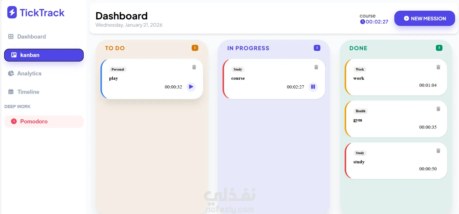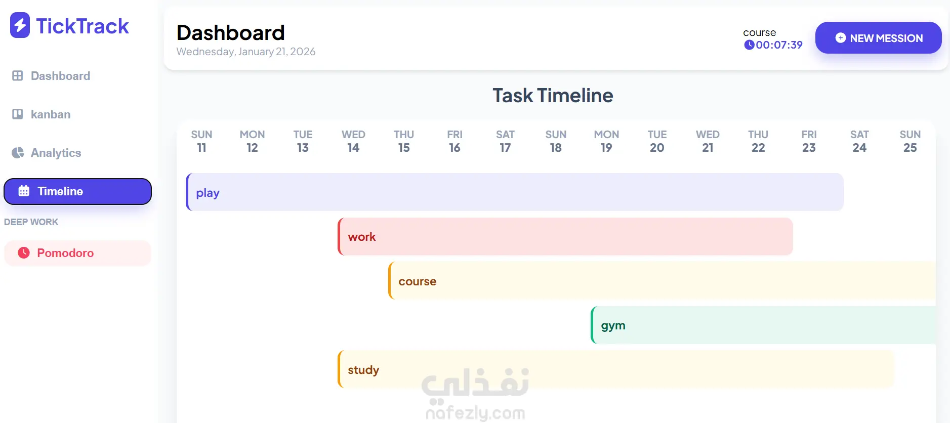أداة التركيز (Pomodoro Timer): مؤقت متكامل مخصص لجلسات "Deep Work" يساعد المستخدم على التركيز العميق مع إمكانية التخصيص.