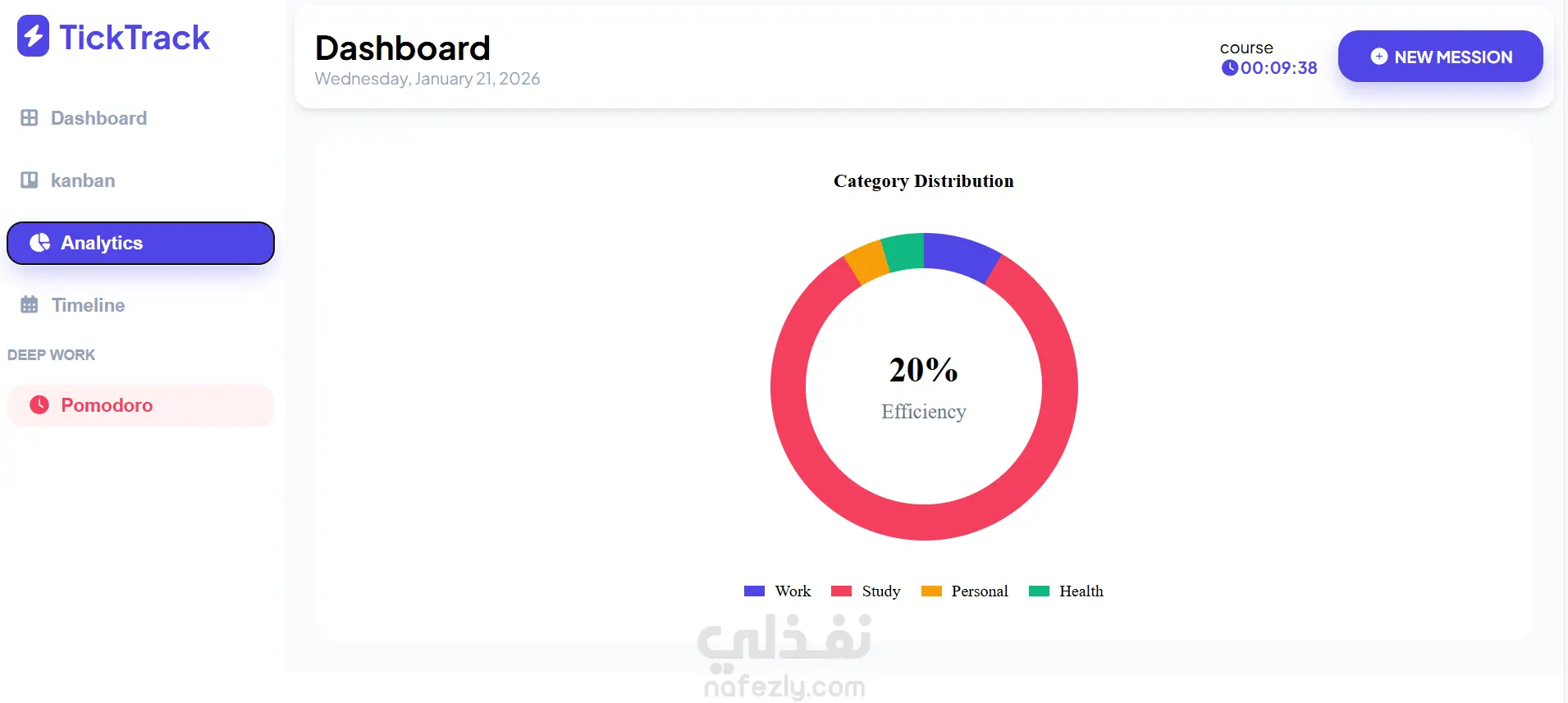 التحليل البياني (Data Visualization): رسوم بيانية تفاعلية توضح توزيع المهام حسب الفئات (Work, Study, Health, Personal) وقياس الإنتاجية الأسبوعية.